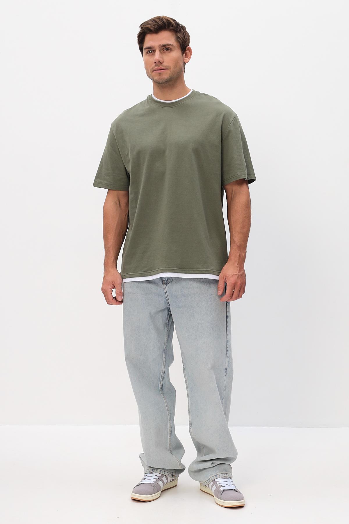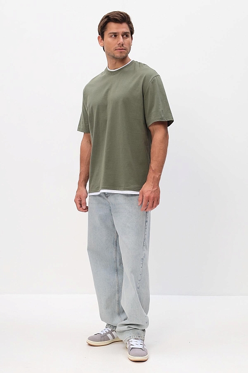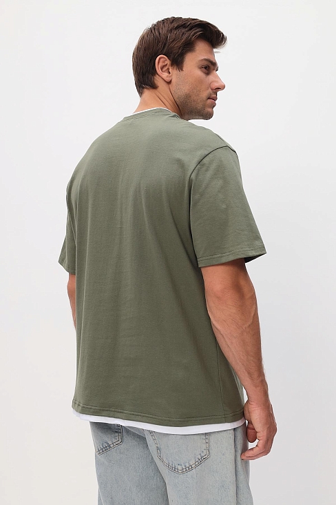 Однотонная хлопковая футболка с имитацией двойной футболки с коротким рукавом и круглым вырезом.