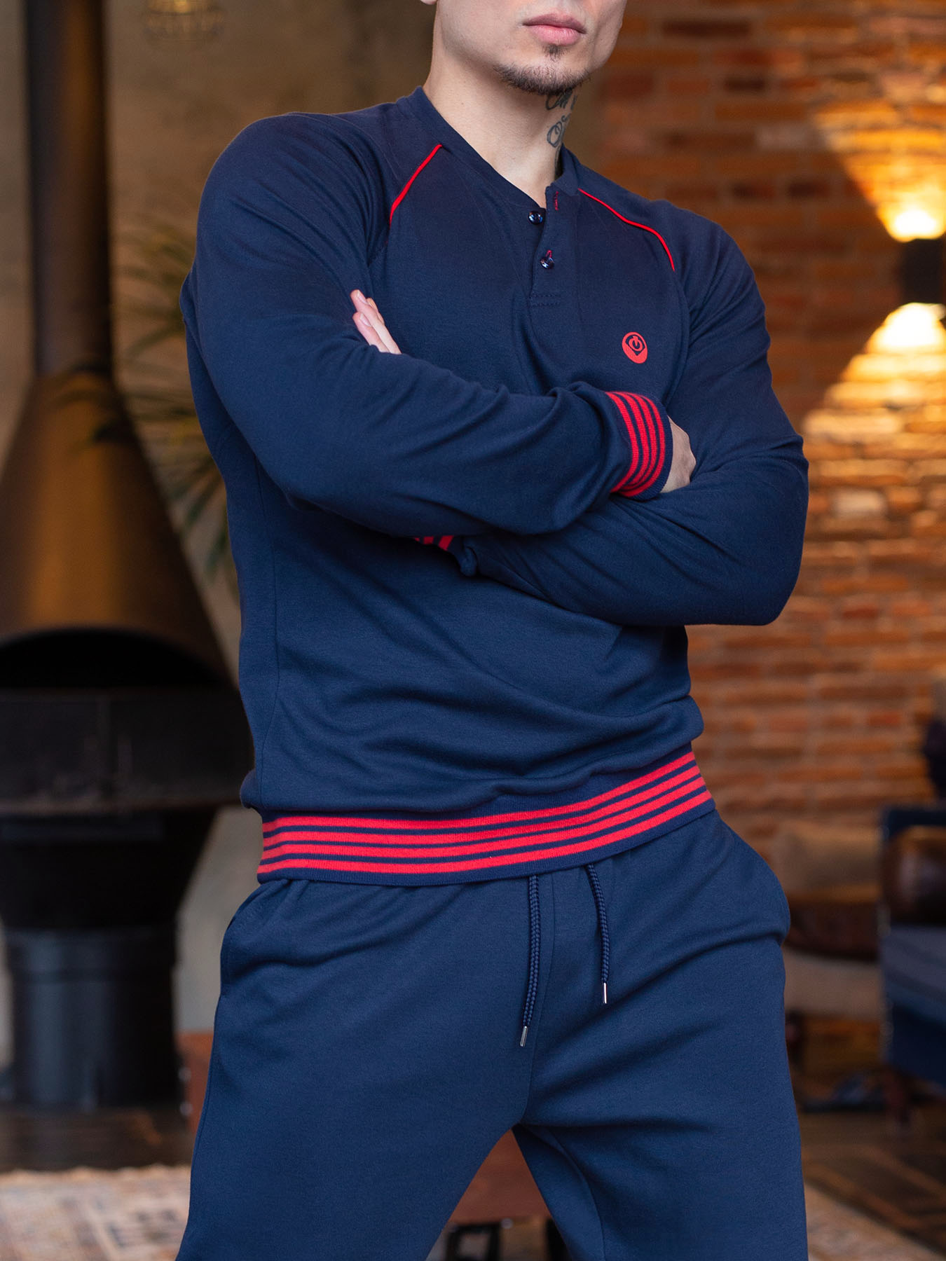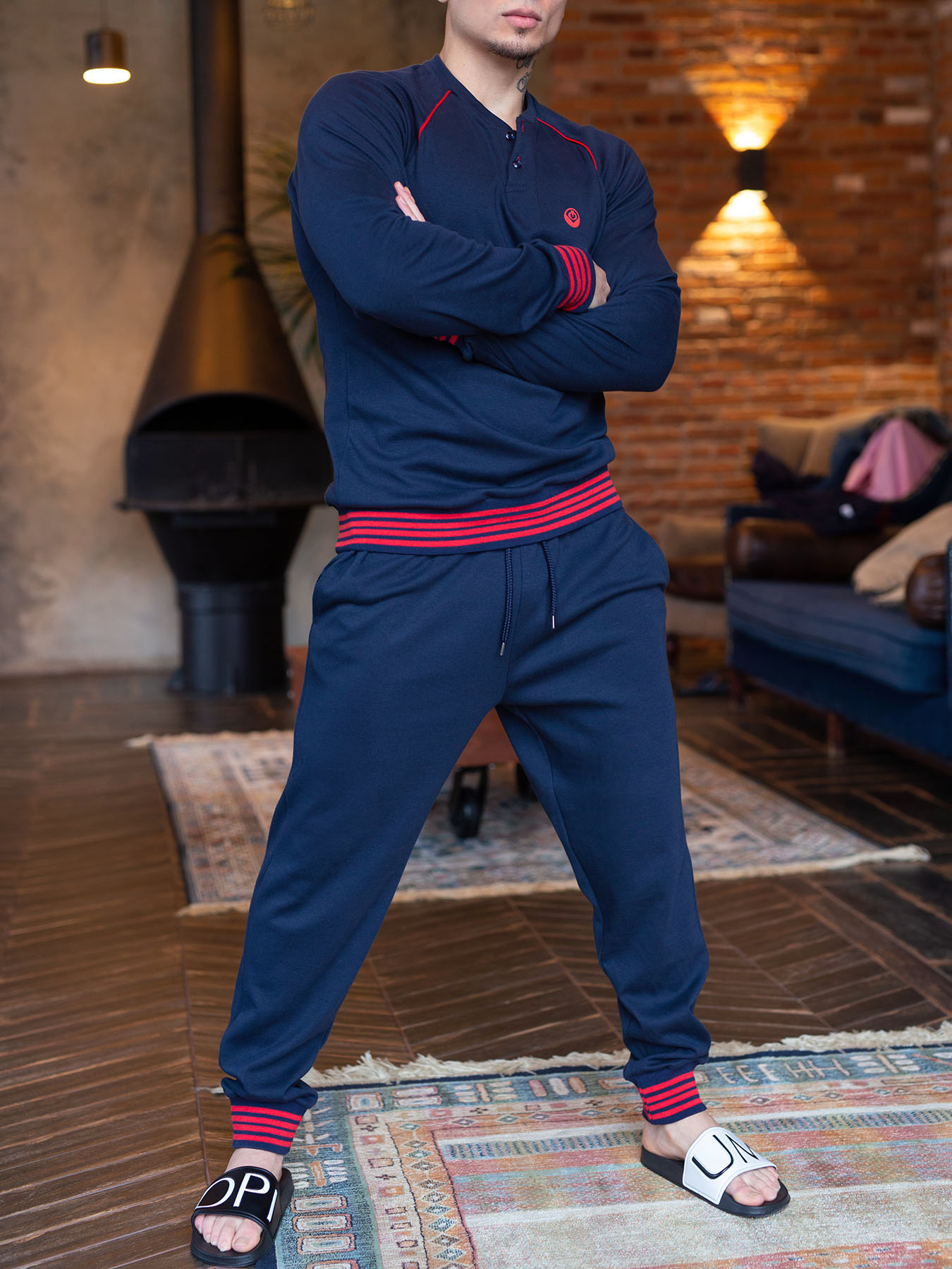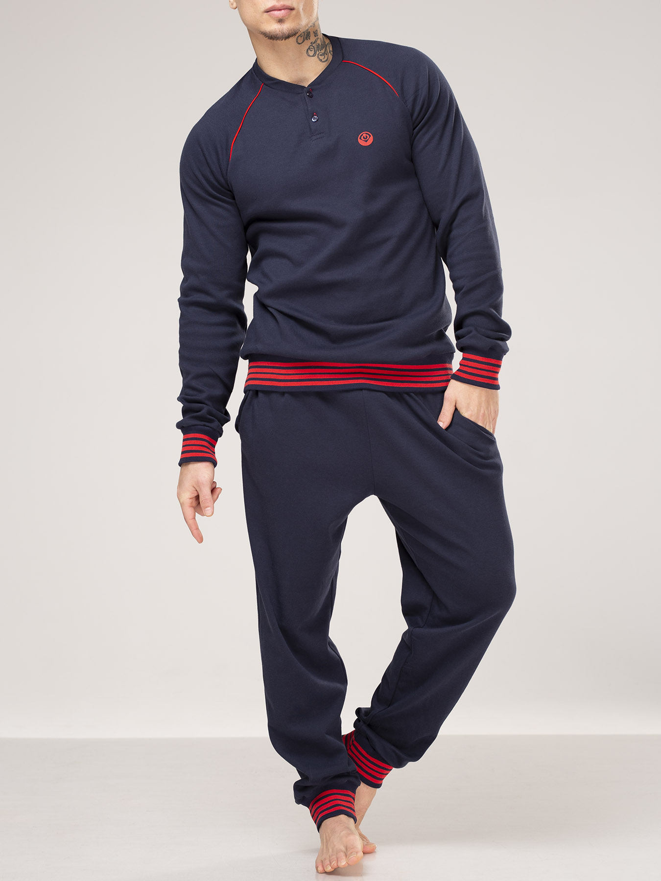 Мужская пижама – стильный фасон, гармоничное сочетание цветов, мягкий хлопковый трикотаж позволяет использовать ее в качестве одежды для отдыха в кругу семьи. Интересный элемент – знак OPIUM на груди - служит дополнительным украшением этой уютной и в то же время достаточно брутальной модели. Для дополнительного удобства – внутренние карманы в брюках.