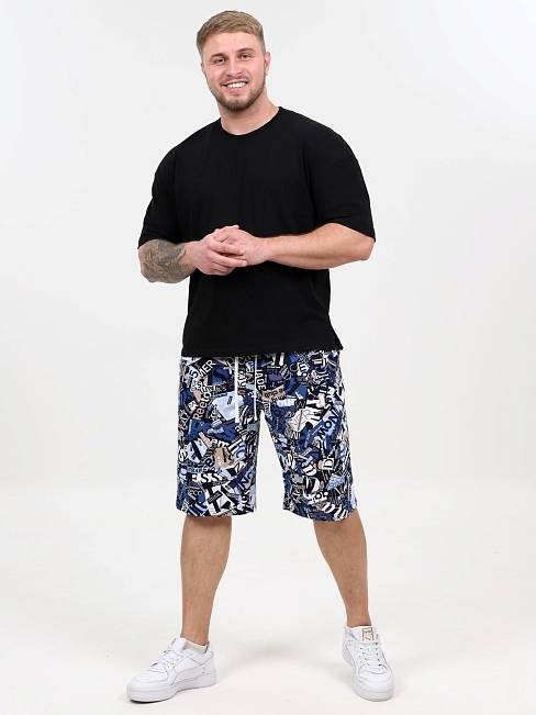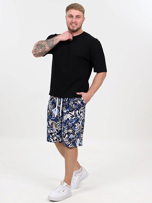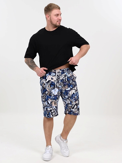 Яркие мужские шорты Маршрут из 100% хлопка, на притчном поясе с эластичной тесьмой внутри, с карманами в боковых швах. В центре пояса - две обметанные петли, через которые продет шнурок с наконечниками для регулирования  степени прилегания шорт по талии.