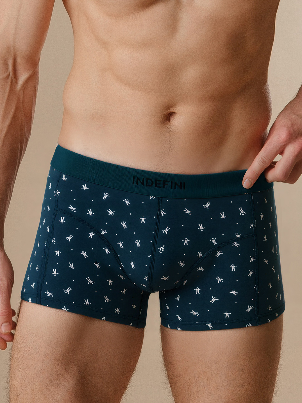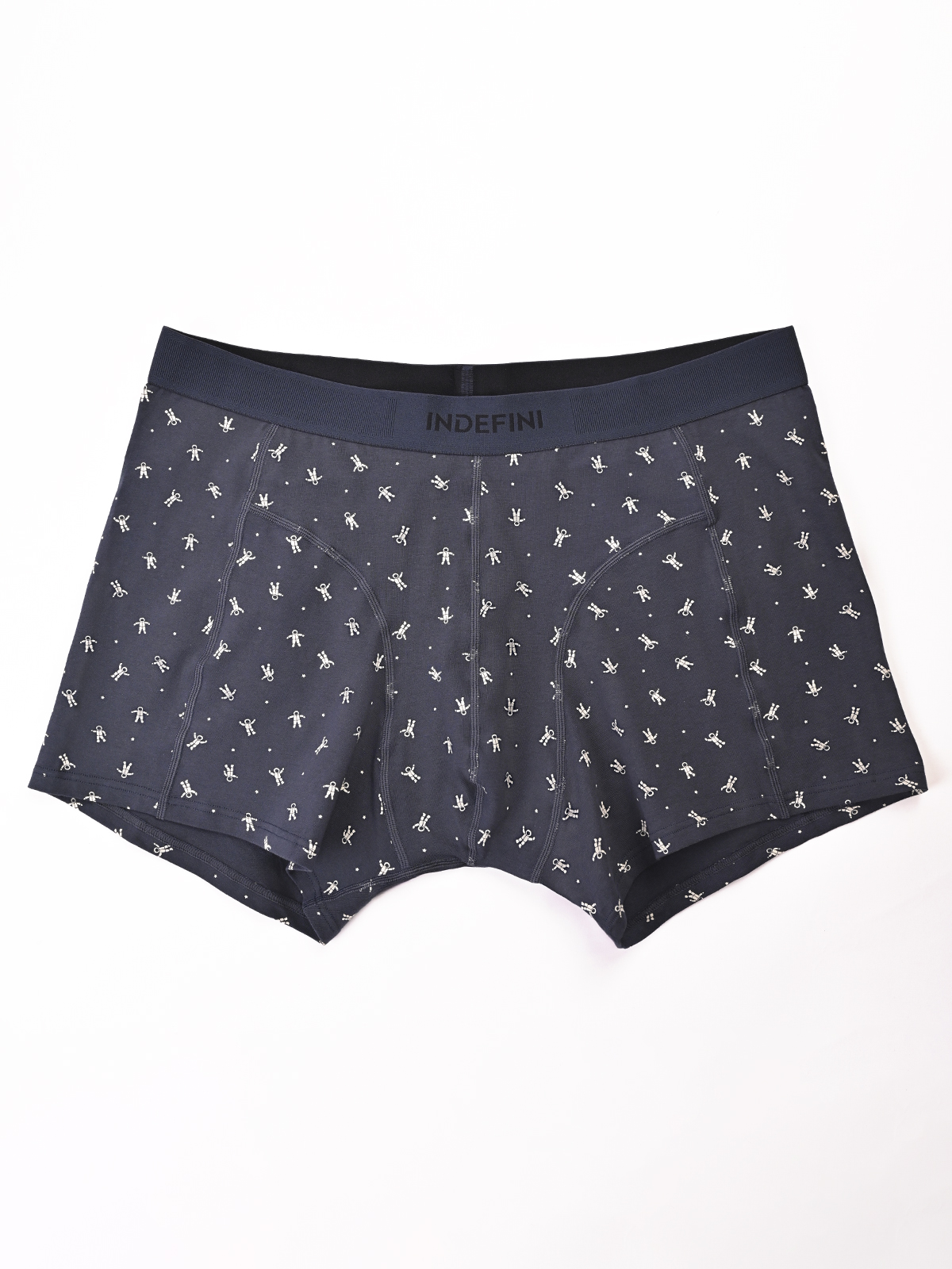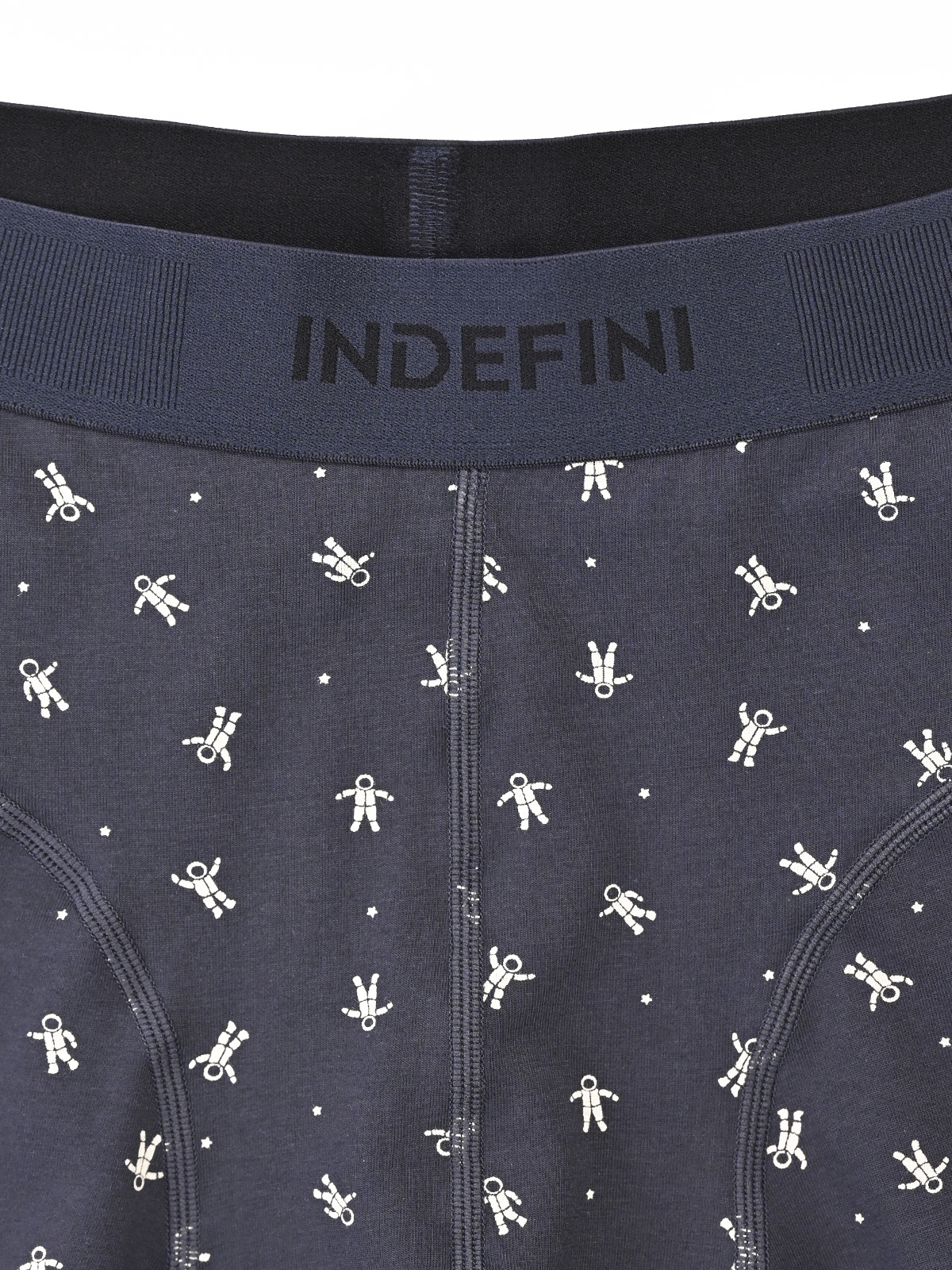 Мужские трусы-боксеры -  отличный выбор в качестве повседневного нижнего белья. Трусы отлично сидят на фигуре и не натирают. Удобная резинка с логотипом INDEFINI мягко облегает талию. Оригинальный дизайн выполнен в виде рисунка космонавтов на синем фоне. В составе изделия хлопок с добавлением эластана, благодаря чему трусы прослужат долго, создавая чувство комфорта в течение всего дня.