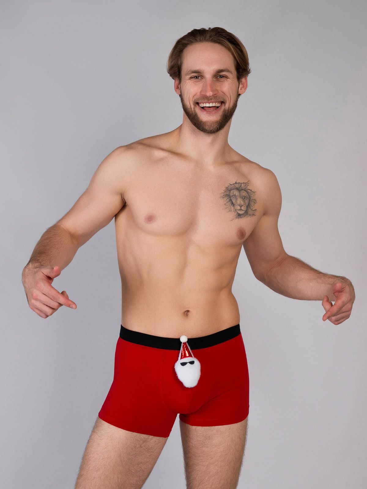 Трусы-боксеры украшены липучкой спереди в форме головы Деда Мороза.