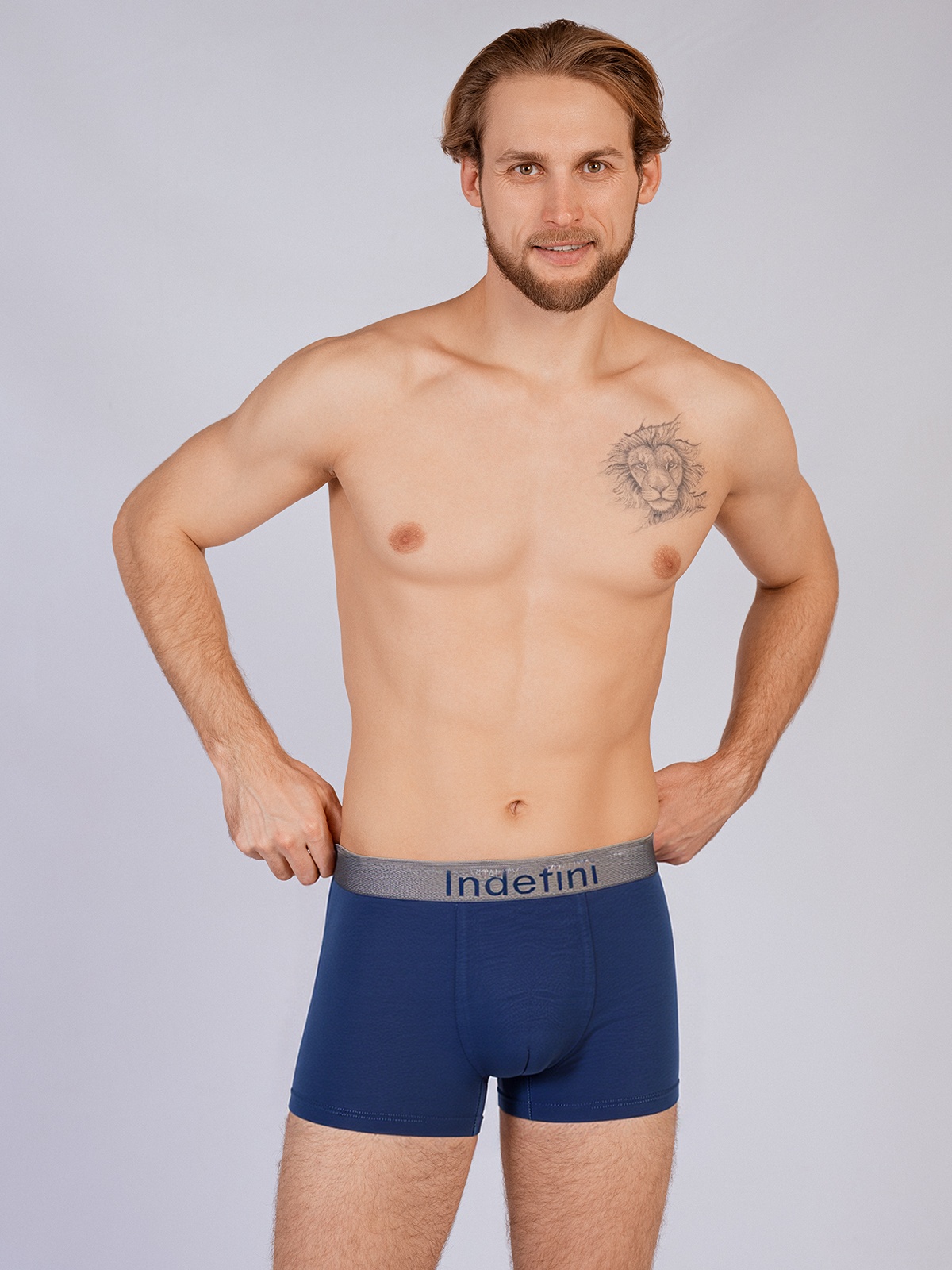 Комфортные и стильные синие боксеры Indefini с широкой мягкой резинкой, украшенной фирменным логотипом. Модель выполнена из натурального хлопка с добавлением эластана, что обеспечивает отличную посадку и свободу движений.