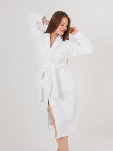 Модель халата с поясом позволяет ему быть универсальным и подходит к любому типу телосложения, скрывая недостатки и подчеркивая достоинства фигуры. Наличие карманов делает его практичным для ношения дома, в бане или сауне, а также на отдыхе.