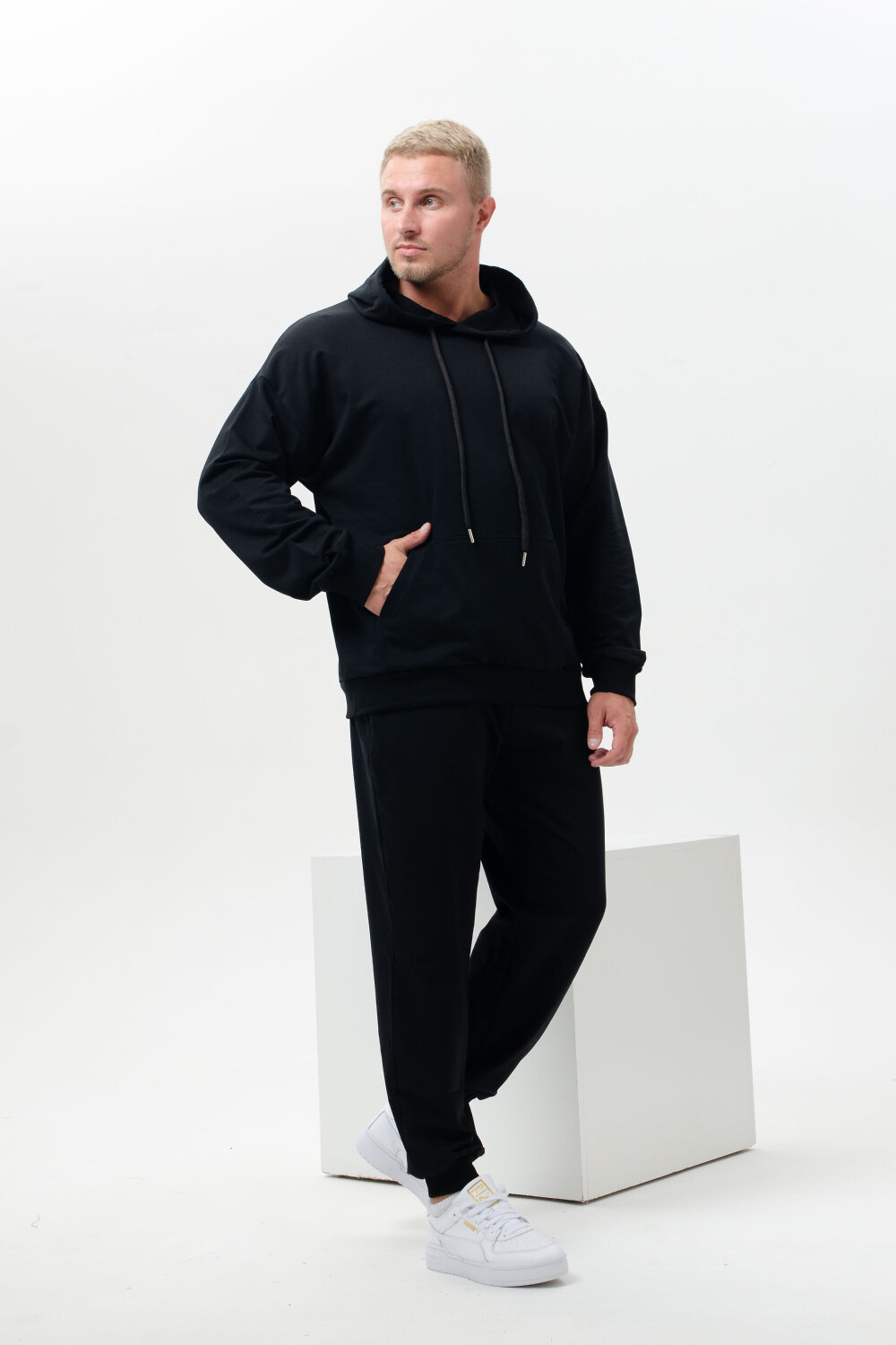 Костюм спортивный мужской с худи и джоггерами. Костюм свободного кроя состоит из толстовки с капюшоном и карманом кенгуру и брюк джоггеров на манжете с карманами в боковых швах. Костюм однотонный сшит из качественного хлопкового трикотажного материала - футера 2-х нитки. Обладает отличной эластичностью, не сковывает движений. Идеален для занятий спортом. Зимой костюм возможно носить в тренажерный зал или использовать как домашнюю одежду.