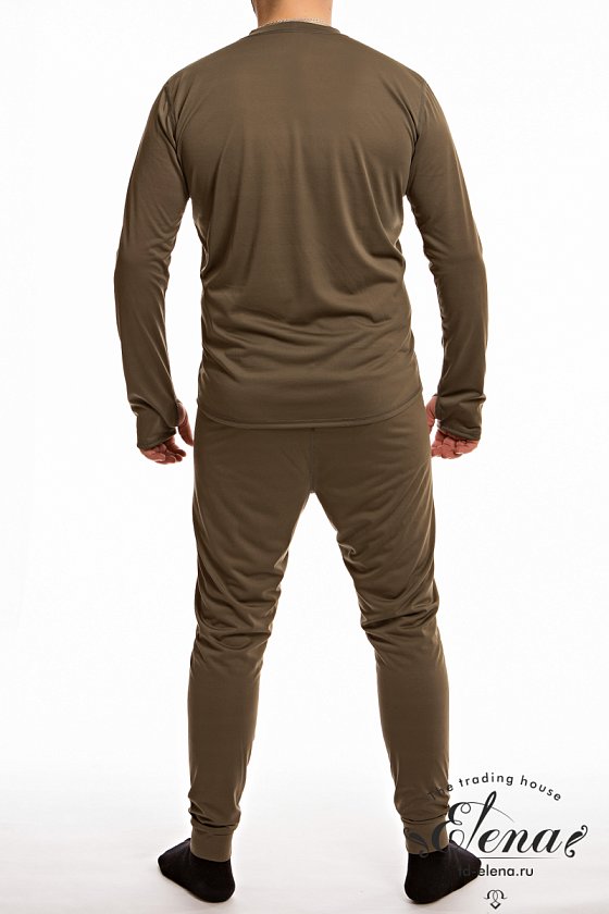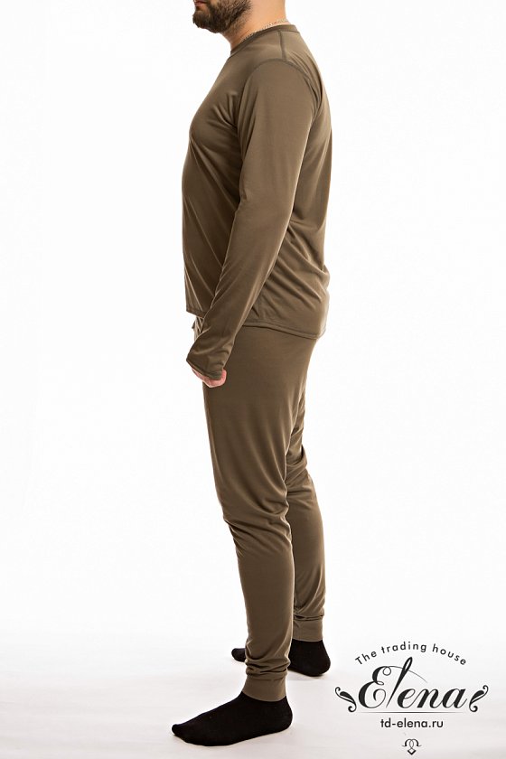 Белье из трикотажного синтетического полотна, состоит из кальсон и футболки. Футболка с круглым вырезом горловины и длинным рукавом с отверстием для большого пальца. Кальсоны с гульфом, пояс на резине.