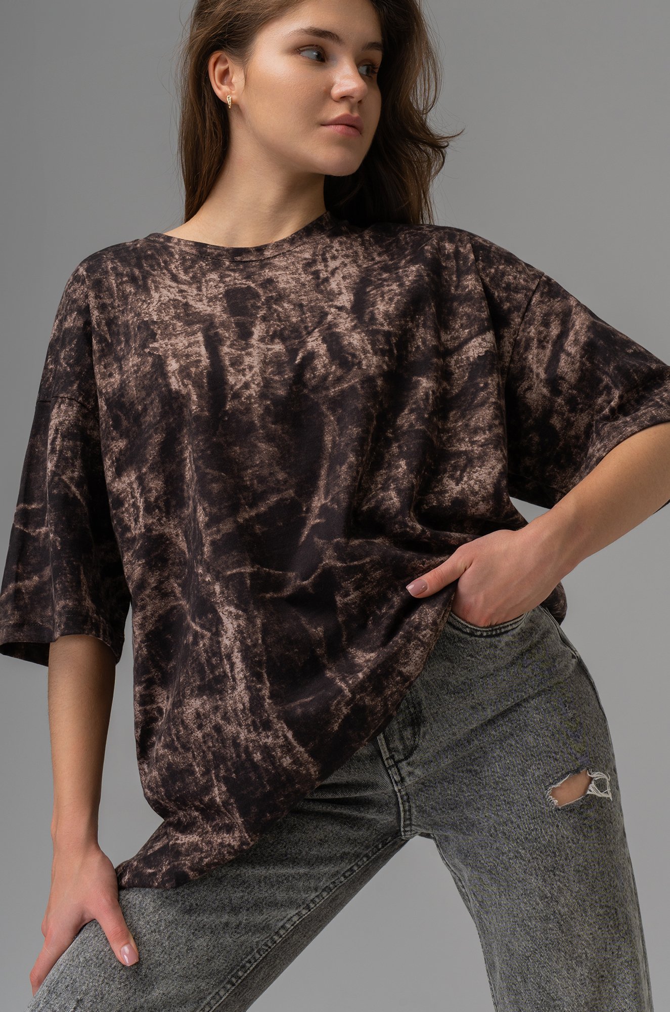Коричневая трикотажная футболка для женщин отлично подойдёт для образов в уличном стиле.