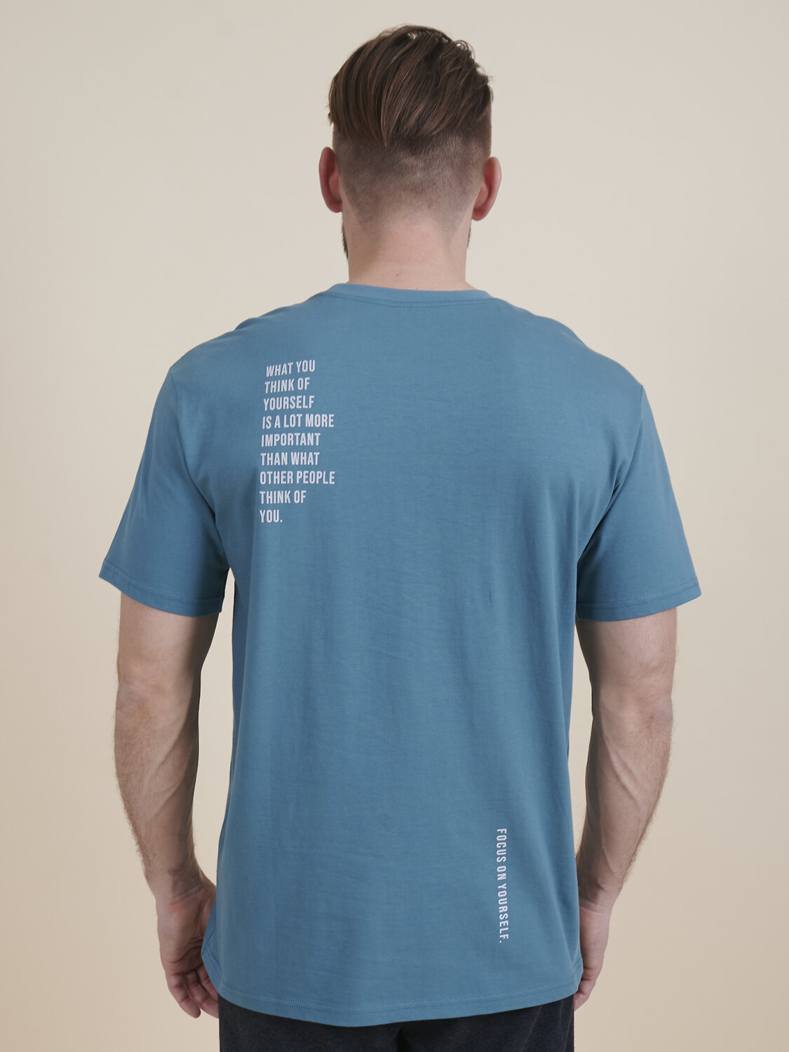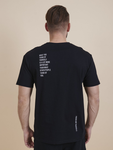 Мужская футболка оверсайз с принтом. Футболка свободного кроя подарит вам комфорт и свободу движения. Джемпер такого силуэта скрывает недостатки фигуры и подчёркивает достоинства. Майка с комфортными свободными рукавами идеальна для повседневной носки. Модель неприхотлива в уходе. Трикотажная футболка по спинке украшена стильными лаконичными принтами, оригинально расположенными не по центру. Надписи переводятся: "То, что ты думаешь о себе, гораздо важнее того, что думают о тебе другие", "Сосредоточься на себе". Принты качественные и стойкие — без проблем переносят многочисленные стирки. В составе ткани 100% хлопка — футболка мягкая, приятная на ощупь и позволяет коже дышать. Модель представлена в трёх цветах: бежевая футболка, зелёная, чёрная. Размерная линейка: M (46-176): M (46-188): L (48-176): L (48-188): XL (50-176): XL (50-188): XXL (52-176): XXL (52-188): 3XL (54-188). Майка идеальна для мужчин, молодых парней, подростков. Базовая футболка оверсайз универсальна, отлично подходит для работы, учёбы, спорта, прогулок, отдыха, а также для дома и сна. Легко сочетается с различными брюками и шортами. Её можно носить летом, зимой и в демисезон (осенью и весной). Футболка с принтом оверсайз — это прекрасный подарок брату, мужу или папе на любой праздник. Выбирайте нужный размер по таблице размеров на фото. Цвет товара на экране вашего устройства может отличаться от цвета изделия вживую.