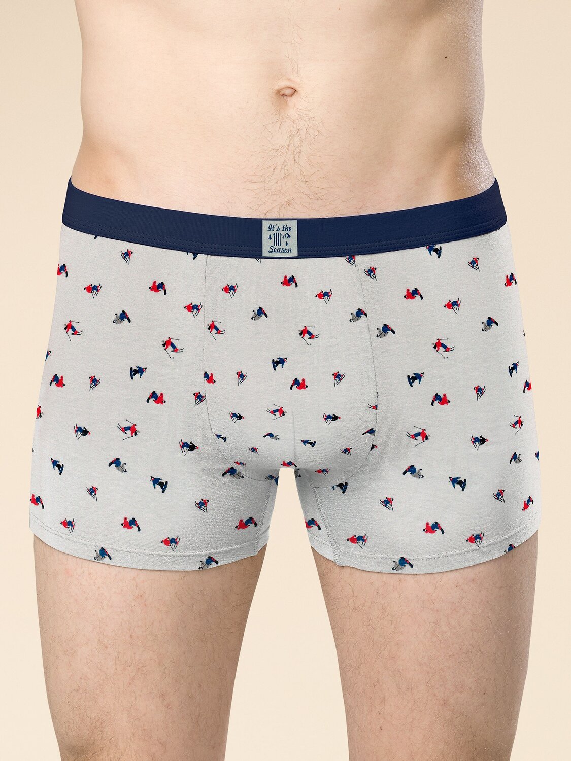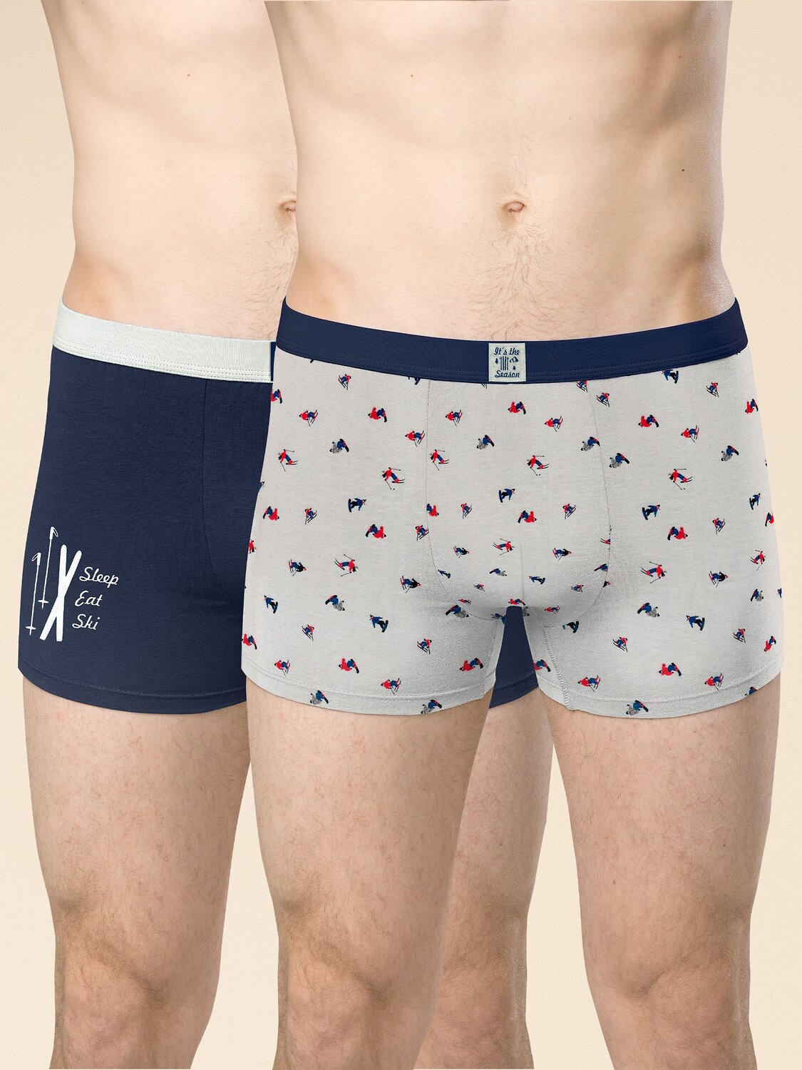 Трусы мужские шорты, набор из 2 штук. Трусы мужские по типу боксеры от бренда Pelican выполнены из хлопка и эластана в составе прочной трикотажной ткани, имеют анатомическую посадку, с двойной вставкой спереди, плотные, не просвечивают. Средняя посадка, плотно прилегают к телу, обеспечивая комфортную носку, у данной модели широкий размерный ряд. По талии широкий тканый эластик – удобная резинка контрастного цвета-компаньона шириной 3 см., которая в процессе носки не растягивается, не натирает. Ткань при многократной стирке не линяет, остается яркой, темные цвета – универсальны и отлично носятся под узкие брюки или нательное белье мужское, термобелье, пижаму. Материал прочный, долго носится и не скатывается, за счет хлопковой нити обладает гигроскопичностью, легко впитывает влагу, при этом телу всегда будет комфортно. Боксеры в спортивном стиле представлены в двух цветах – однотонном светло-синем и в голубом с мелким рисунком по мотивам активный лыжный спорт, в одной цветовой сдержанной гамме. Трусы мужские боксеры - хороший вариант для ежедневной носки, а также в качестве подарка как трусы мужские набор на новый год, 23 февраля. Это неотъемлемая часть гардероба мужчины, отличное нижнее белье. Трусы мужские шорты – это аксессуар, который оценит не только любой мужчина, но и подросток, для которого комфорт в одежде и удобство превыше всего. Удачный вариант как подарочный набор для мужчины трусы с надписью It's the season (Это сезон…) – на бирке и надписью сбоку Sleep, Eat, Sky (…Спать, есть, кататься на лыжах), тематическим рисунком - лыжи, горы, зима.