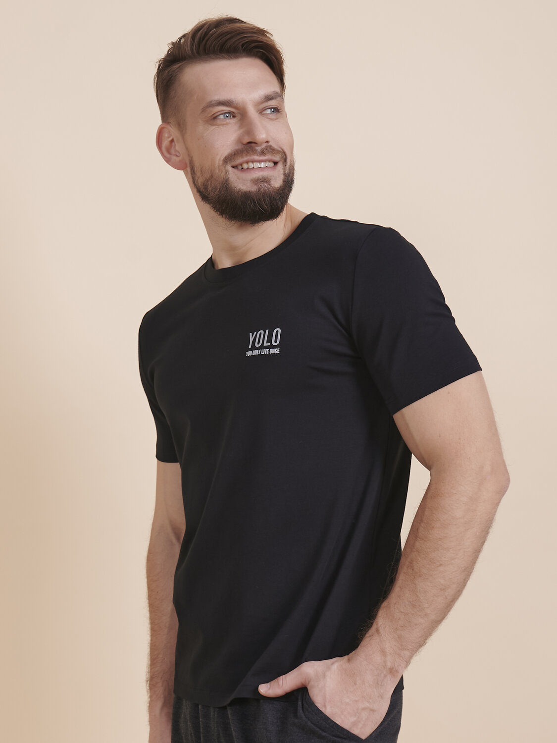 Стильная мужская футболка прилегающего силуэта с принтом. Укороченная футболка мужская подчёркивает достоинства фигуры. Рукава средней длины с глубокой проймой обеспечивают комфорт и свободу движения. Модель неприхотлива в уходе. Трикотажная футболка по переду украшена стильным лаконичным принтом с объёмными буквами, жизнеутверждающая аббревиатура YOLO (от англ. you only live once — "Ты живёшь только один раз"), надпись переводится: "Живём один раз". Принт качественный и стойкий — без проблем переносит многочисленные стирки. В составе ткани преобладает высококачественный хлопок — футболка мягкая, приятная на ощупь и позволяет коже дышать. Эластан помогает изделию надолго сохранить первоначальную форму. Модель представлена в трёх цветах: серая футболка, чёрная, бежевая. Размерная линейка: M (46-176): M (46-188): L (48-176): L (48-188): XL (50-176): XL (50-188): XXL (52-176): XXL (52-188): 3XL (54-188). Майка идеальна для мужчин, молодых парней, подростков. Базовая футболка универсальна, отлично подходит для работы, учёбы, спорта, прогулок, отдыха, а также для дома и сна. Легко сочетается с различными брюками и шортами. Её можно носить летом, зимой и в демисезон (осенью и весной). Футболка с принтом мужская — это прекрасный подарок брату, мужу или папе на любой праздник. Выбирайте нужный размер по таблице размеров на фото. Цвет товара на экране вашего устройства может отличаться от цвета изделия вживую.