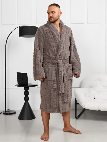Мужской халат из двустороннего махрового хлопкового полотна. Модель на запах, с поясом в шлёвках, с боковыми карманами, с воротником "шаль", с петлей-вешалкой по горловине спинки.