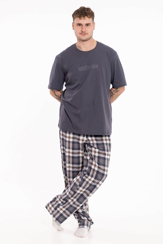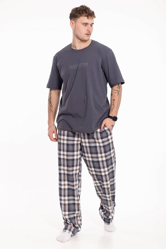Мужская пижама из хлопкового полотна - практичный и удобный комплект для сна и домашнего отдыха. Футболка прямого кроя с втачным рукавом обеспечивает комфортную посадку и свободу движений. Спереди расположен стильный принт, который добавляет образу выразительности. Брюки прямого силуэта, с поясом на мягкой резинке и удобными карманами в боковых швах — всё для комфорта в повседневной носке.