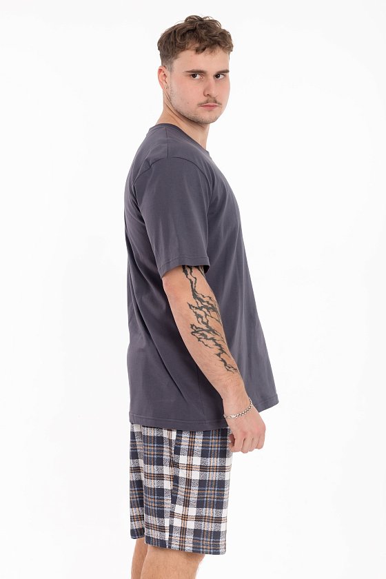 Мужская пижама из хлопкового полотна - практичный и удобный комплект для сна и домашнего отдыха. Футболка прямого кроя с втачным рукавом обеспечивает комфортную посадку и свободу движений. Спереди расположен стильный принт, который добавляет образу выразительности. Шорты с поясом на мягкой резинке и удобными карманами в боковых швах — всё для комфорта в повседневной носке.
