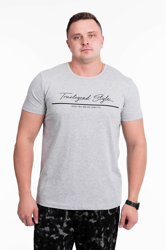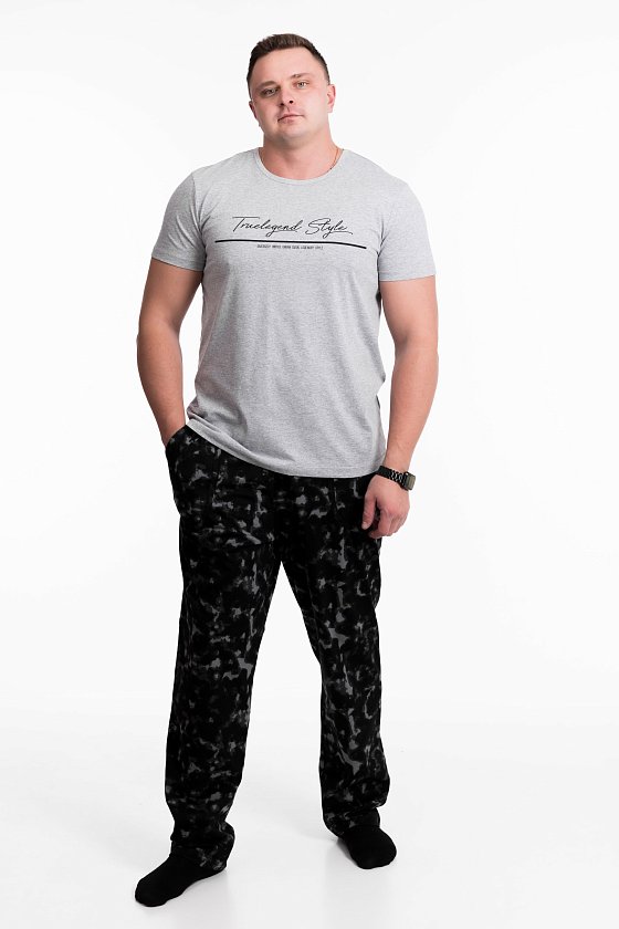 Мужская пижама выполнена из хлопкового полотна, состоит из брюк и футболки. Брюки с поясом на резинке, по бокам расположены карманы. Футболка однотонная, с коротким рукавом и круглым вырезом горловины, оформленным бейкой. Спереди нанесён принт.