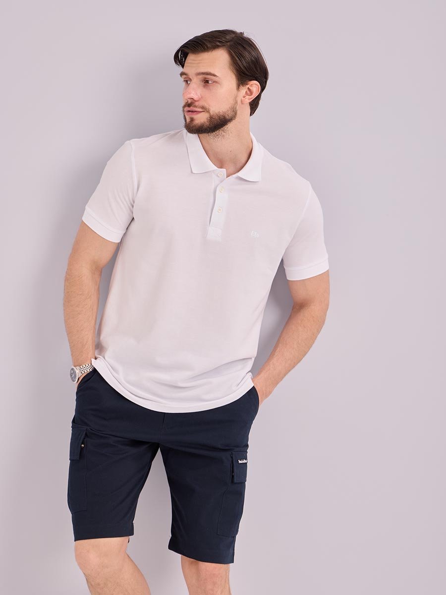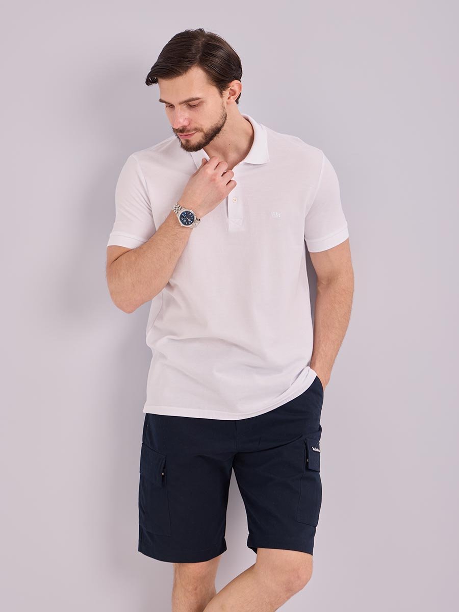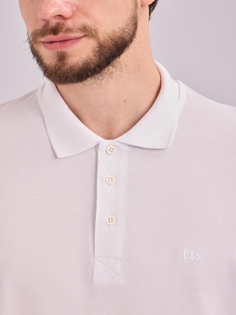 Классическая мужская футболка поло F5, Regular fit (полуприлегающий силуэт), с вышивкой-фирменным логотипом. Выполнена из трикотажного полотна пике (pique). С отложным воротником и короткими рукавами. Застежка-планка застегивается на 3 пуговицы.