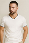 Удобная и комфортная футболка полуприлегающего кроя. Футболка с V – образным вырезом горловины и коротким рукавом.