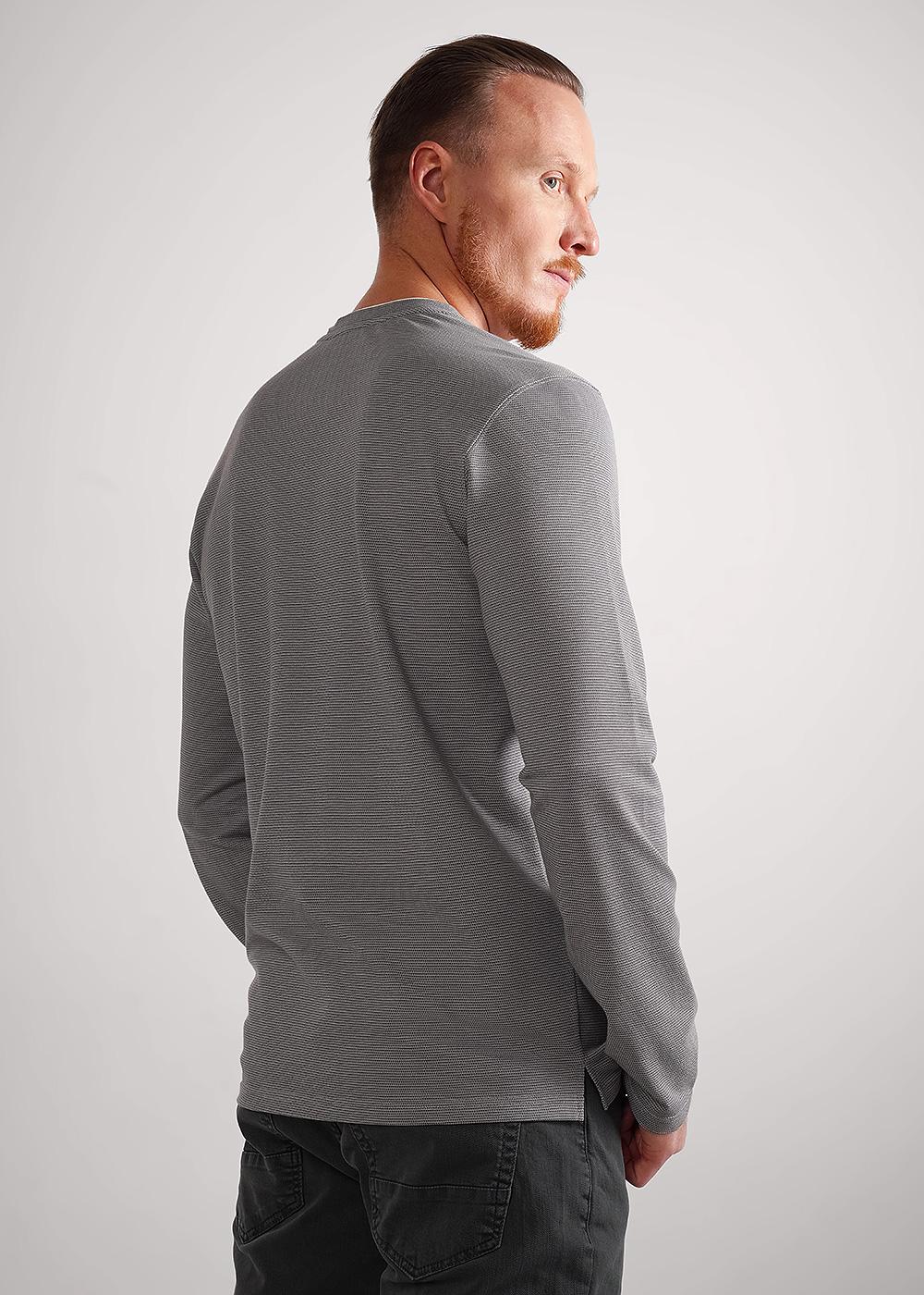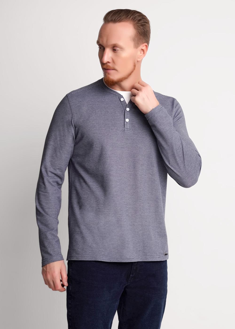 "Описание: Мужской лонгслив из трикотажного фактурного полотна с длинным рукавом и декоративной планкой на пуговицах. Контрастная отделка горловины акцент. Удобная и стильная модель для повседневного образа.