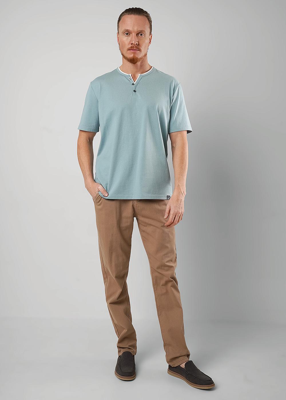"Описание: Футболка из трикотажного плотного хлопкового полотна с воротником-стойка и декоративной планкой на пуговицах. Модель дополнена имиджевой фурнитурой. Отличный вариант на каждый день.