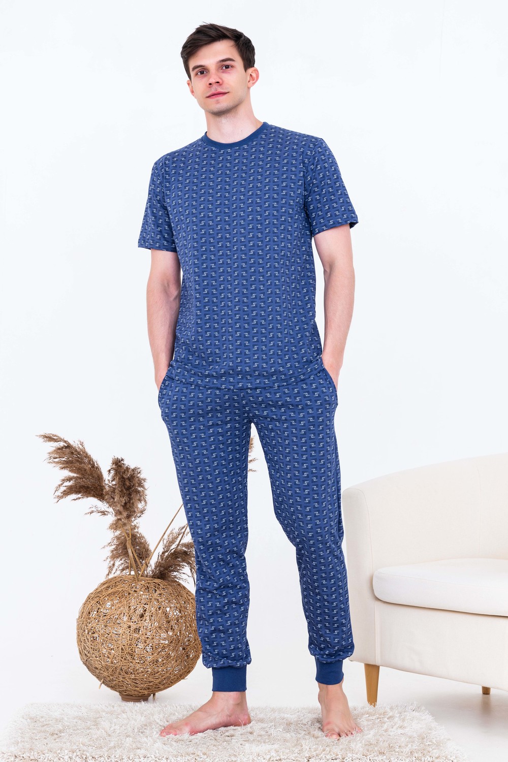 Костюм домашний из 100% хлопка. Очень уютный и удобный. Горловина и манжеты брюк выполнены из эластичной резинки-кашкорсе. Благодаря наличию лайкры в манжетах после стирки они не вытягиваются. Карманы в боковых швах брюк. Пояс на плотной резинке 2 см. Костюм можно с удовольствием носить на любимой даче.