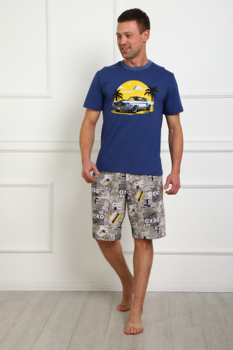 Костюм мужской летний: шорты на эластичном поясе, с карманами в боках и футболка прямого кроя с лаконичной надписью на груди. 100% хлопок обеспечит комфорт.