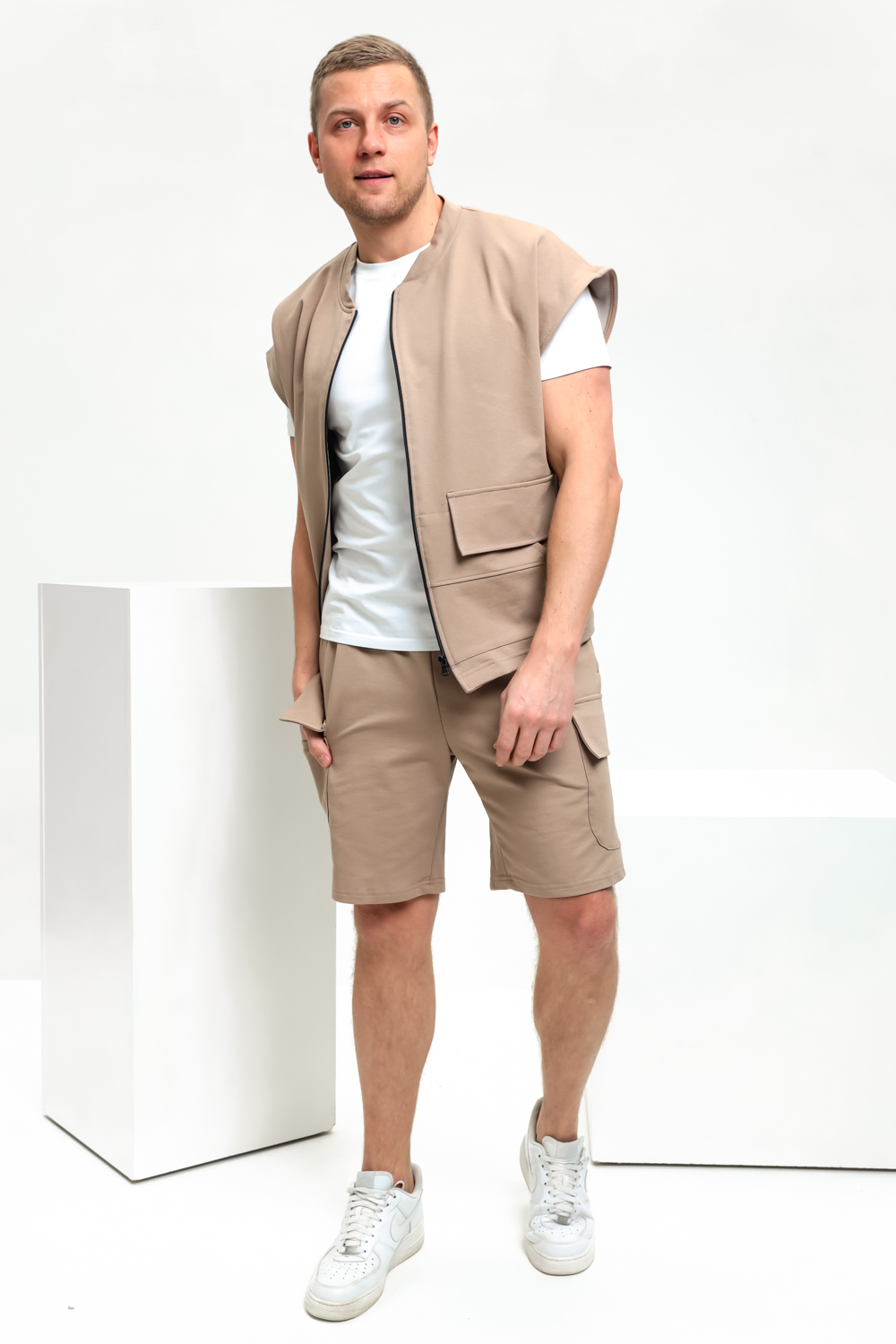 Мужской костюм в городском стиле из плотного мягкого материала. Комплект состоит из жилета оверсайз и свободных шорт. Костюм подойдет как подросткам так и взрослым, он достаточно широк и будет смотреться хорошо на всех, идеален как домашняя одежда, как одежда для прогулок на улице, для перелетов. Жилет универсален, можно сочетать с джинсами. Спортивные шорты можно носить с кофтами и худи. Комплект идеально сочетается с белой футболкой свободного силуэта оверсайз.