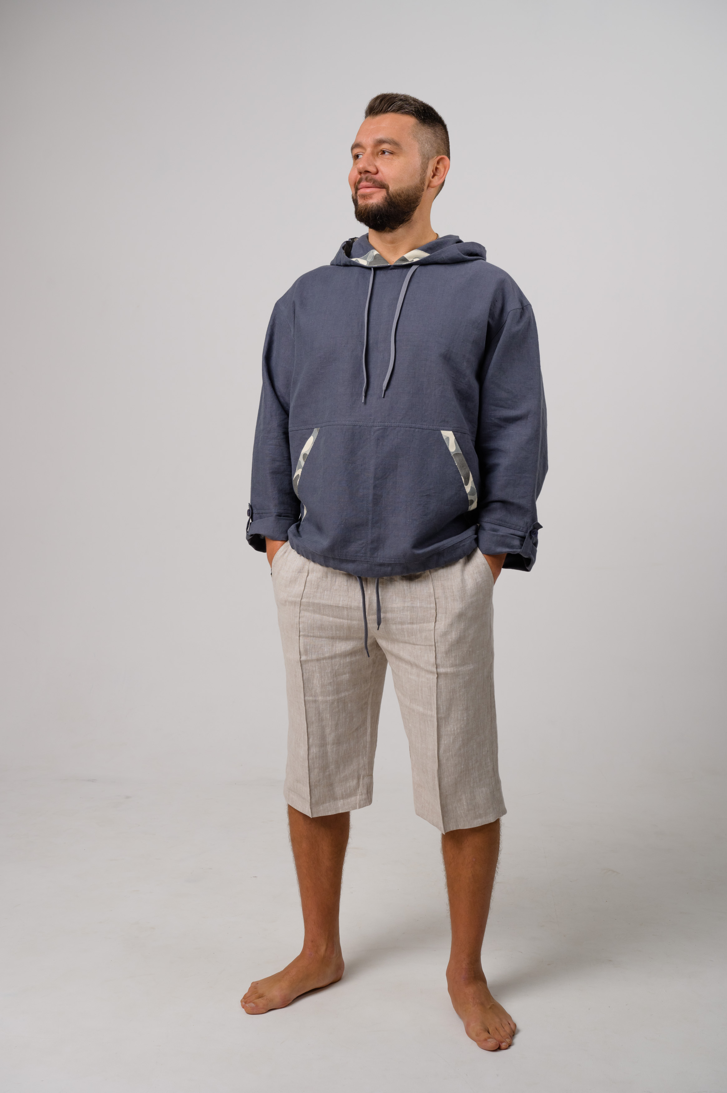 Льняная куртка- анорак с капюшоном будет очень комфортна в прохладную и влажную летнюю погоду. Состав ткани из натуральных нитей позволяет изделию отлично впитывать влагу и пропускать воздух. Куртка не имеет центральной застежки, рукав с регулировкой длины за счет хлястика. В качестве декора использована х/б тесьма дизайна «камуфляж».