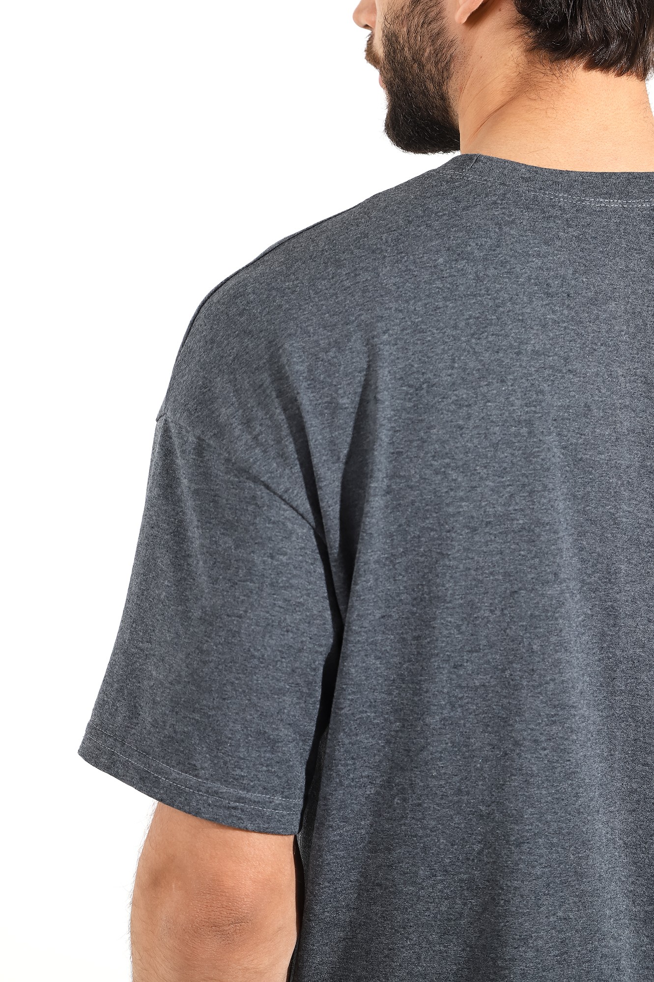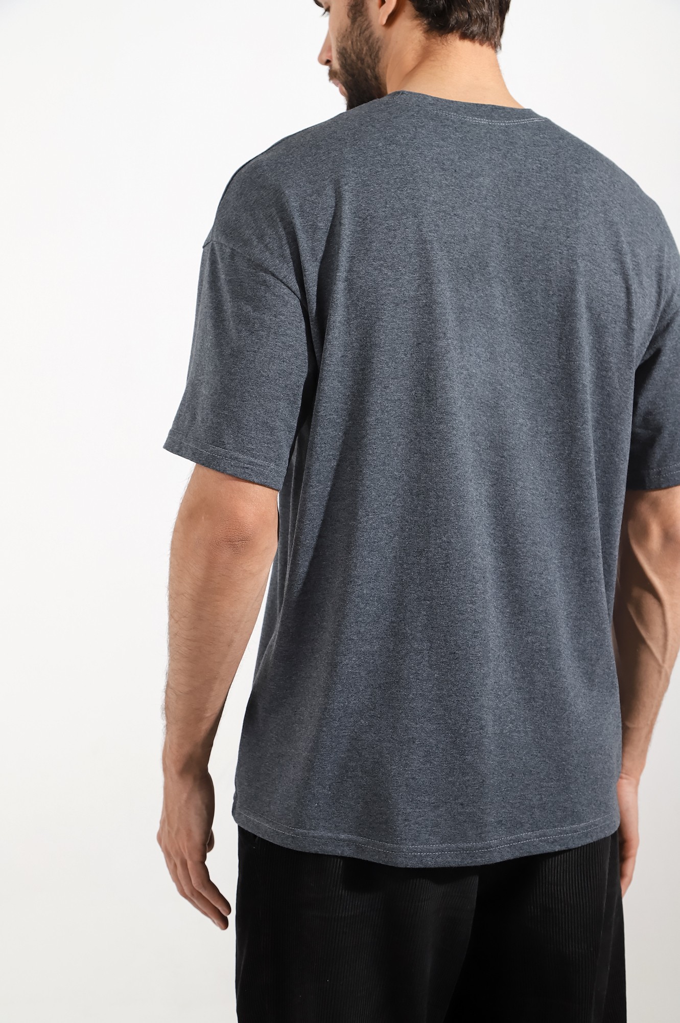 Футболка мужская из меланжированного трикотажного полотна "кулирка", свободного покроя, со спущенным плечом и втачными короткими рукавами. Горловина овальной формы обработана втачной планкой. По шву втачивания планки настрочена двойная отделочная строчка. В центре переда - принт, выплненный в технике шелкографии.