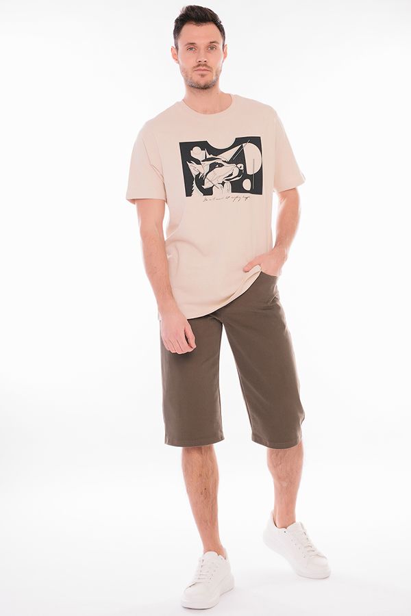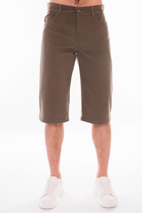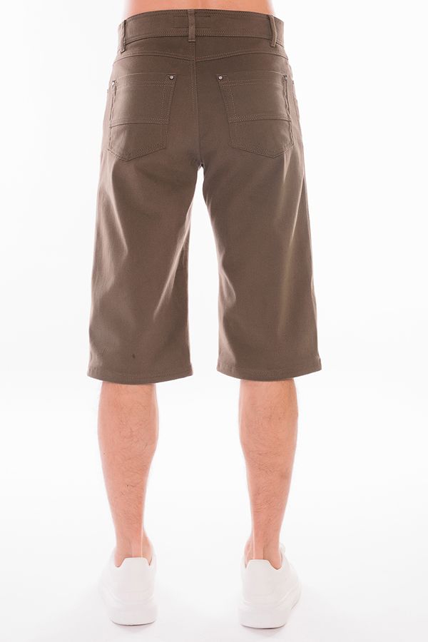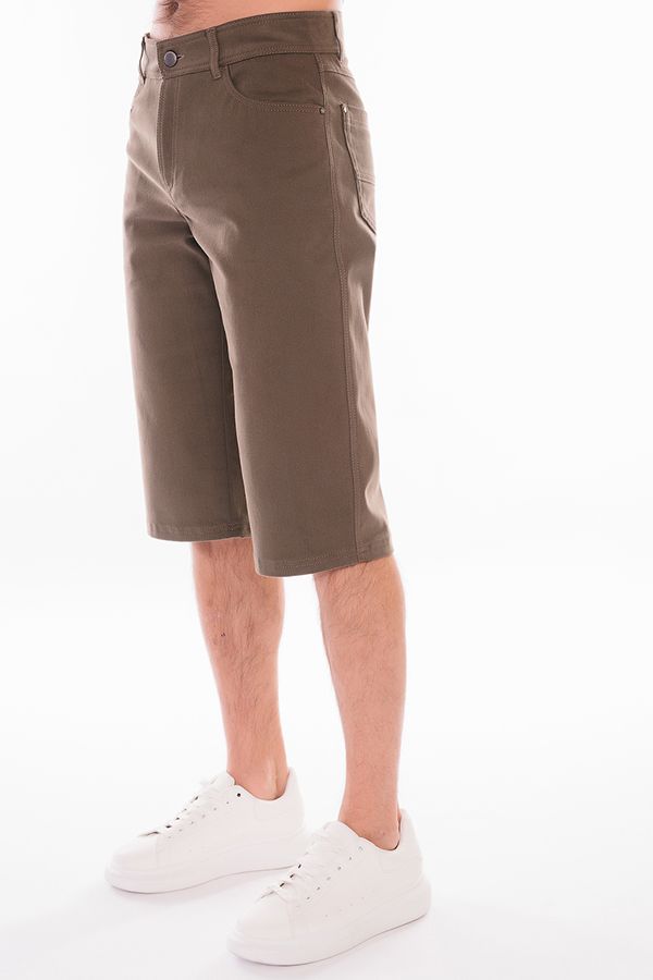 Мужские бермуды "5 карманов" из денима цвета хаки. Детали: спереди  застежка на молнию и пуговицу(болт), боковые карманы, карман для мелочи, сзади под кокеткой накладные карманы, на поясе шлевки. Карманы закреплены хольнитенами. Длина по внутреннему шву - 41 см. Ширина по линии низа -  25 см. *Числовые параметры соответствуют размеру 48. Размер модели на фото: 48. Параметры модели: 100-78-105. Рост модели на фото: 181 см.