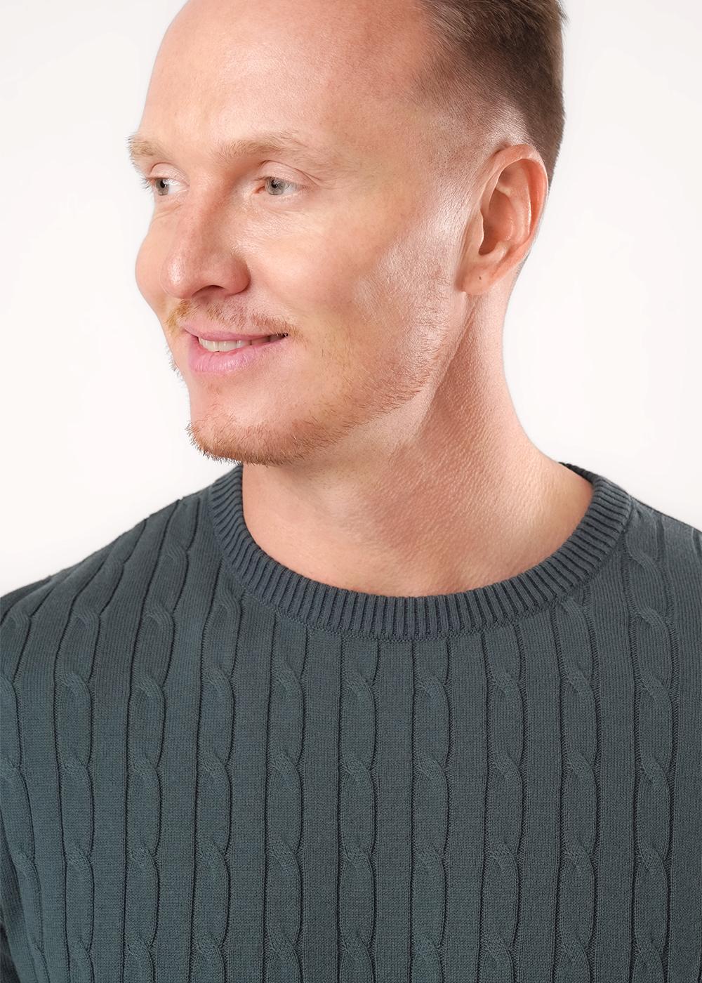 "Описание: Джемпер мужской из смесовой хлопковой пряжи с длинным рукавом и груглой горловиной. Изделие дополнено вязкой с классическим узором косы. Прекрасно сохраняет тепло, отличное решение на холодное время года. Комбинируется с джинсами или брюками.