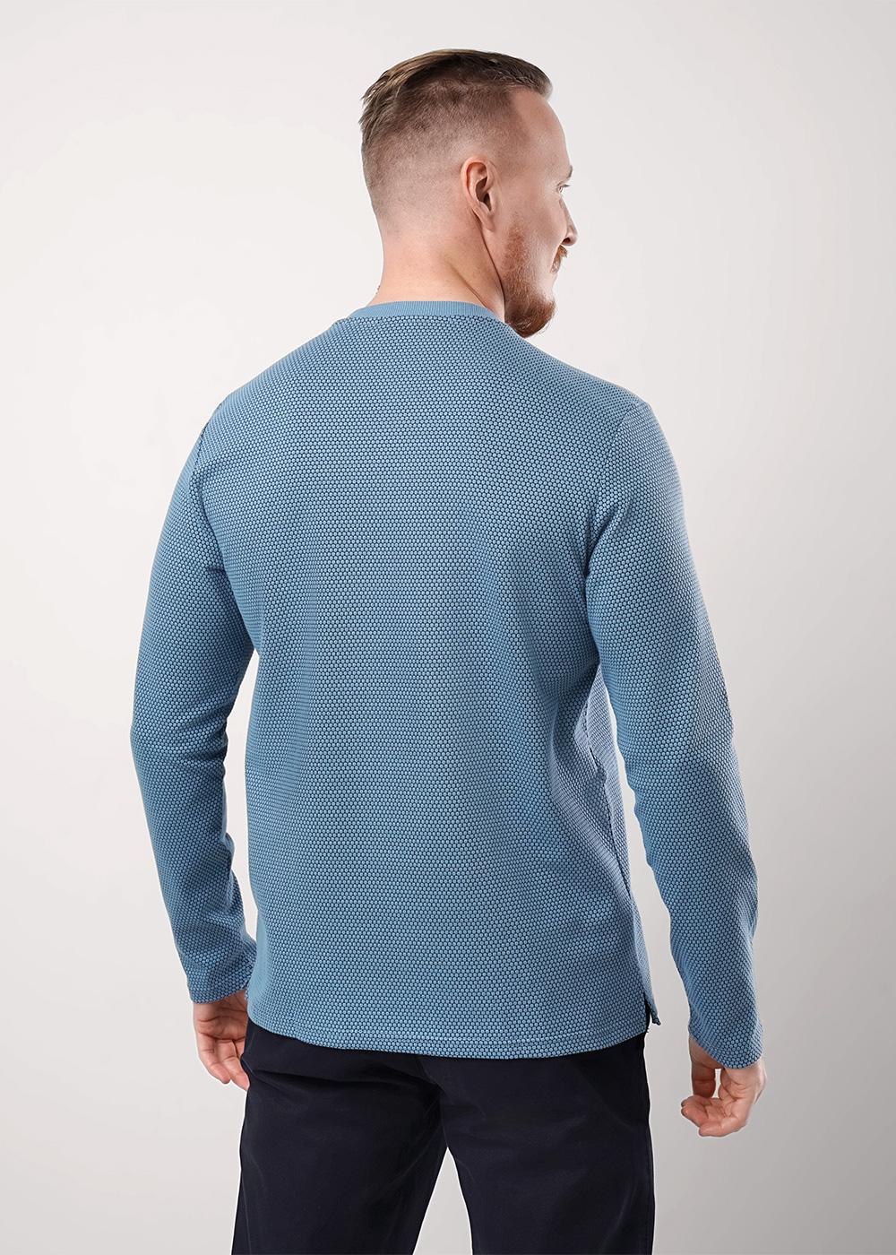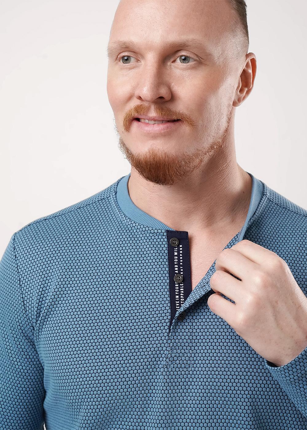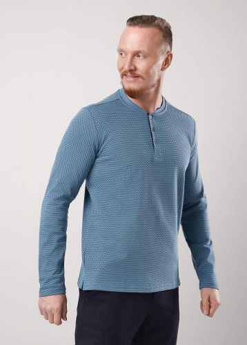 "Описание: Джемпер из трикотажного фактурного полотна ячейка. Изделие с удобной планкой на пуговицы и дополнено дизайнерским принтом. Данная модель отличное дополнение к брюкам или джинсам. Прекрасно подойдёт для встречи с друзьями.