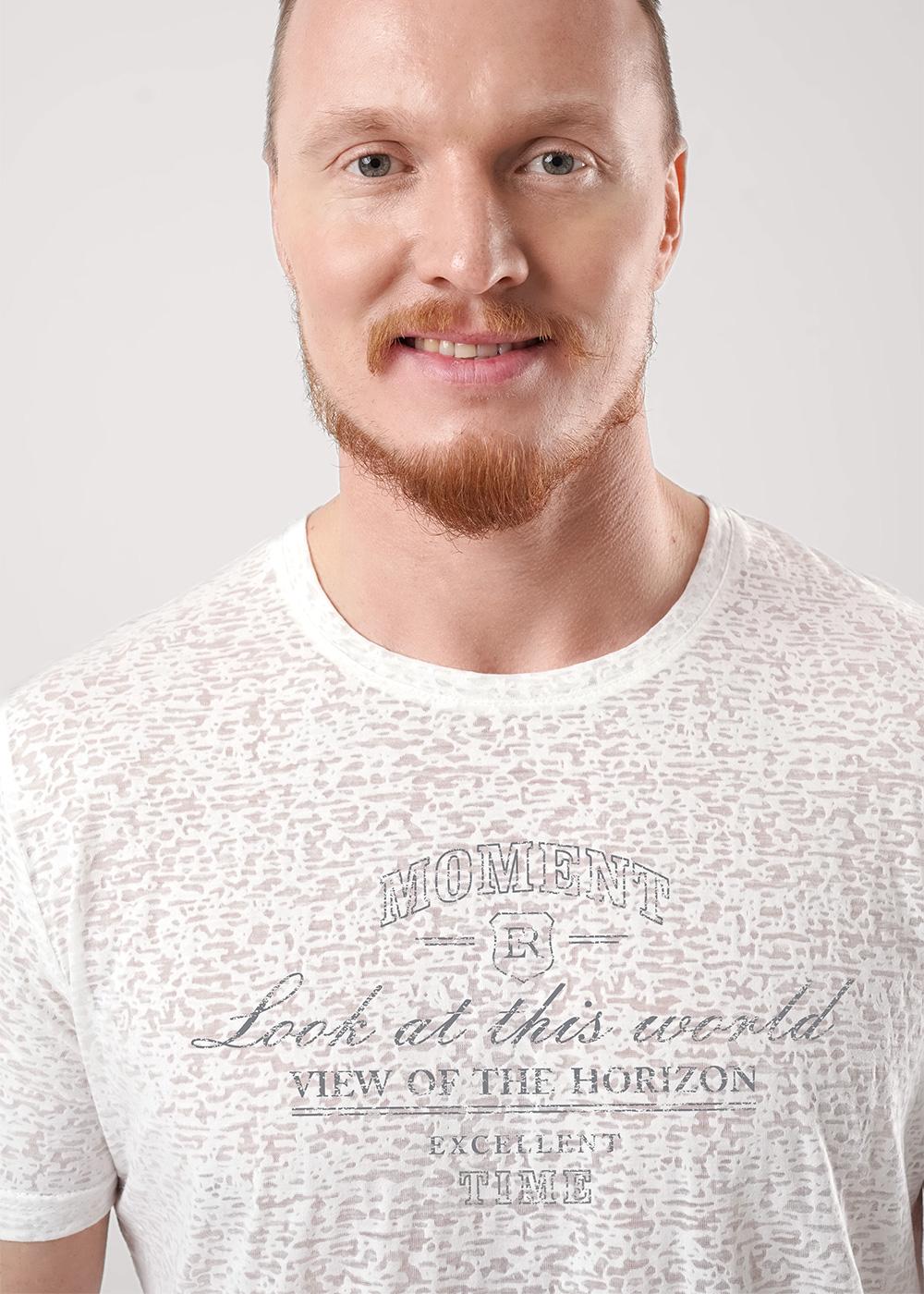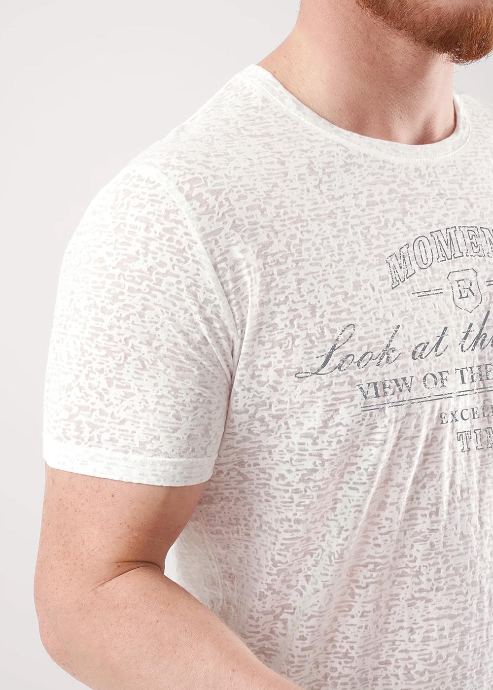 "Описание: Футболка с эффектом деворе из трикотажного полотна с содержанием хлопка. Модель дополнена дизайнерским принтом. В данной футболке можно отправиться на встречу или прогулку с друзьями.
