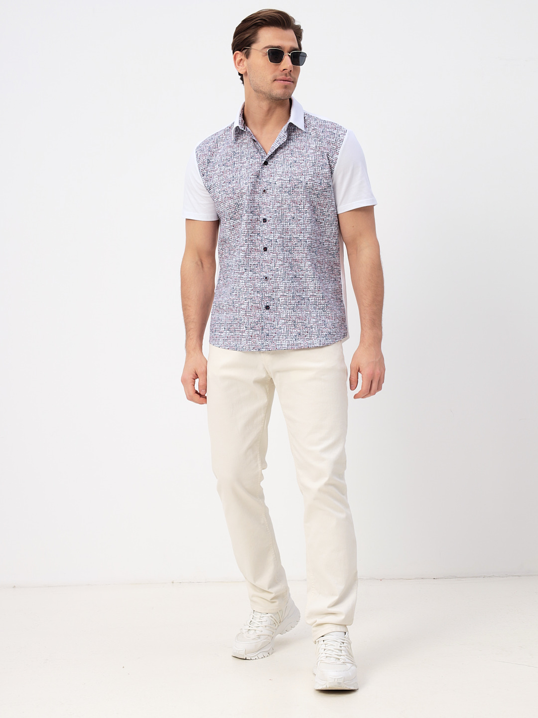 Цвет: Белый Рисунок: Абстрактный<..показать/li> Состав: 95% хлопок 5% лайкра Модель: Классическая Ворот: Из основной ткани на стойке Караман: отсутствует Силуэт: Прямой силуэт / Сlassic fit/li>