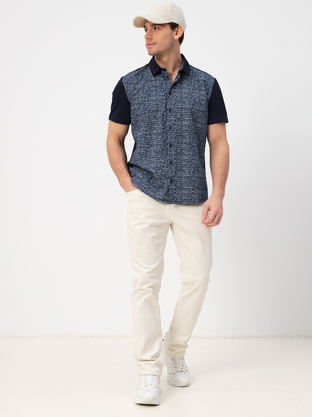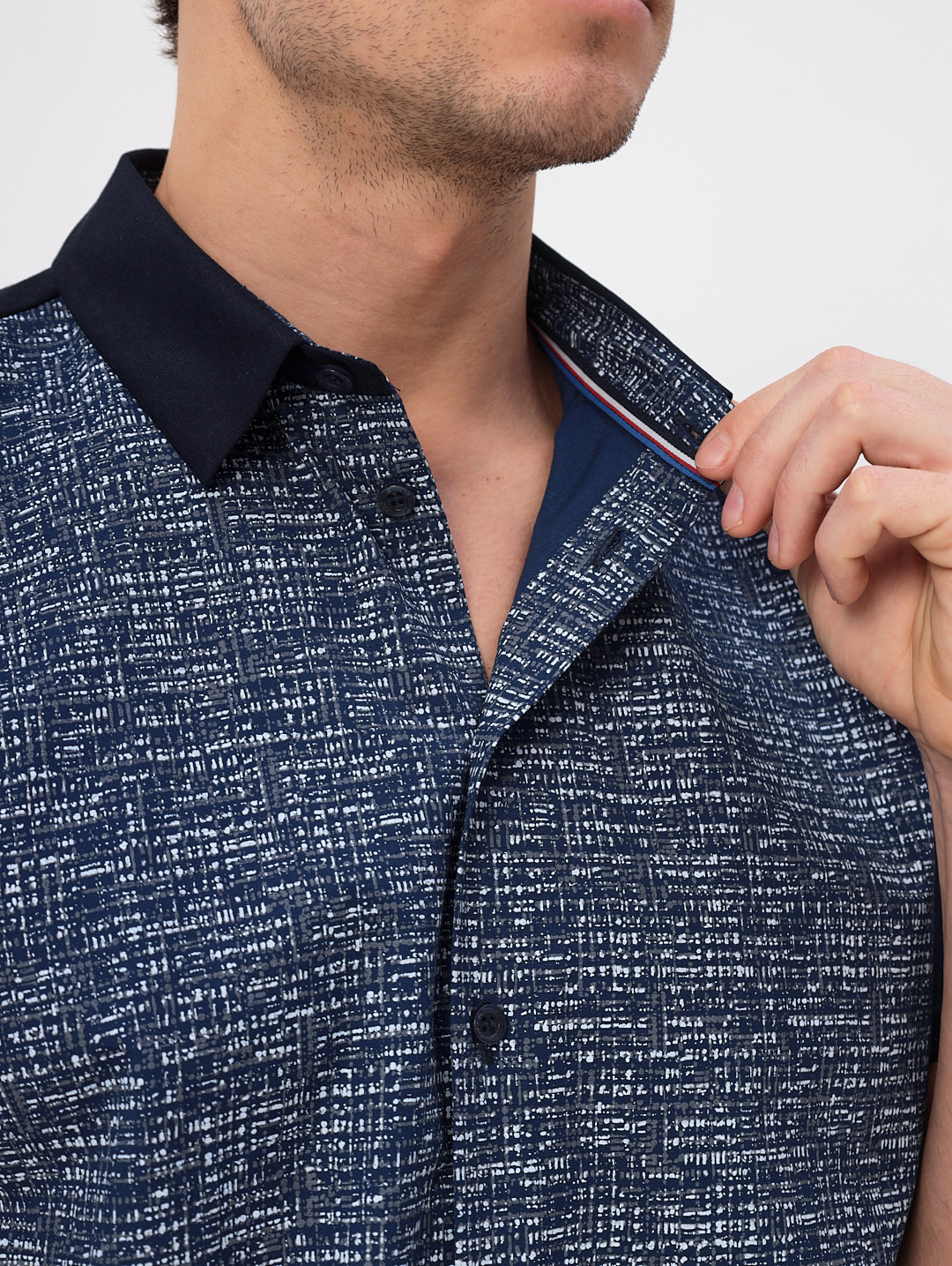 Цвет: Синий Рисунок: Абстрактный<..показать/li> Состав: 95% хлопок 5% лайкра Модель: Классическая Ворот: Из основной ткани на стойке Караман: отсутствует Силуэт: Прямой силуэт / Сlassic fit/li>