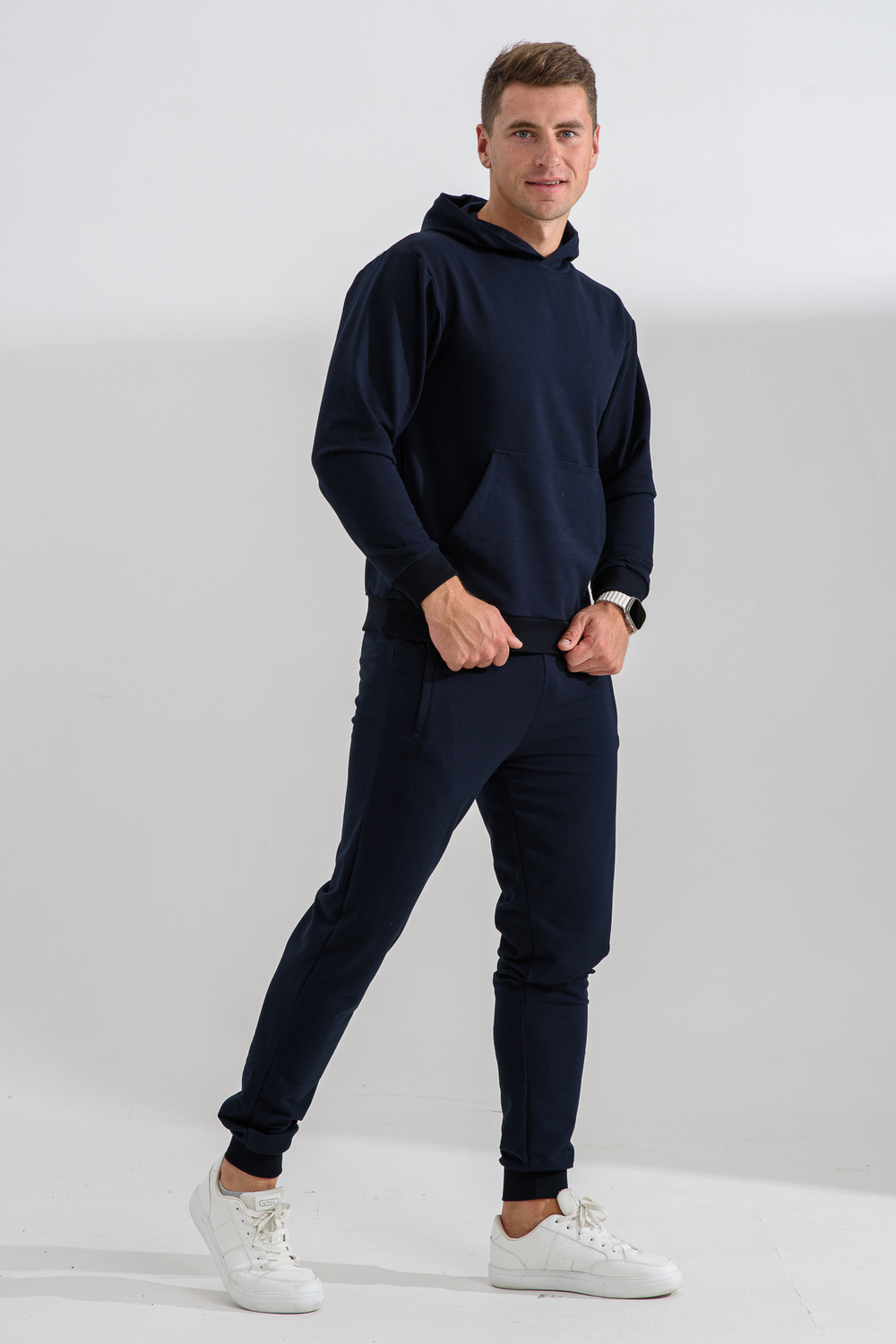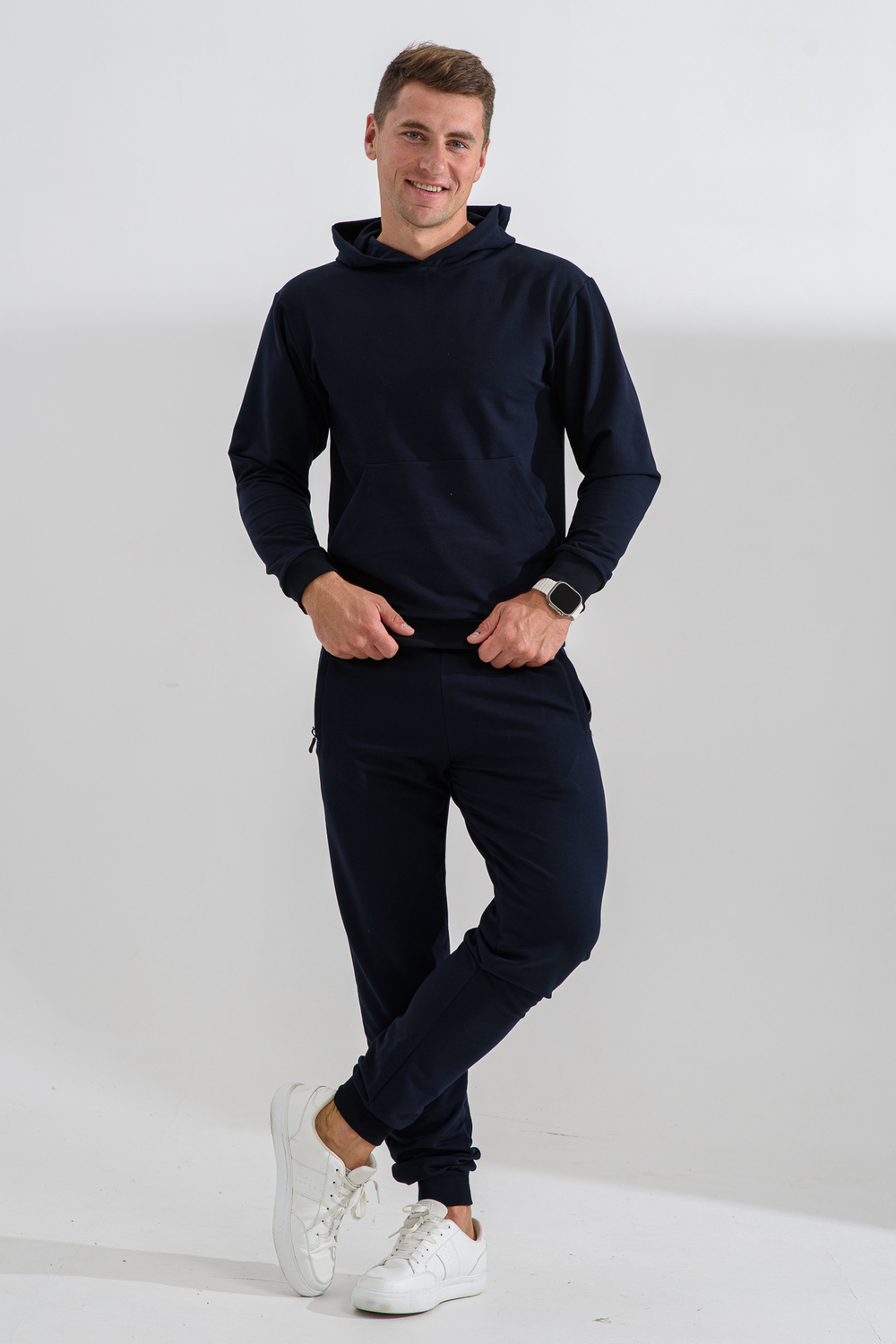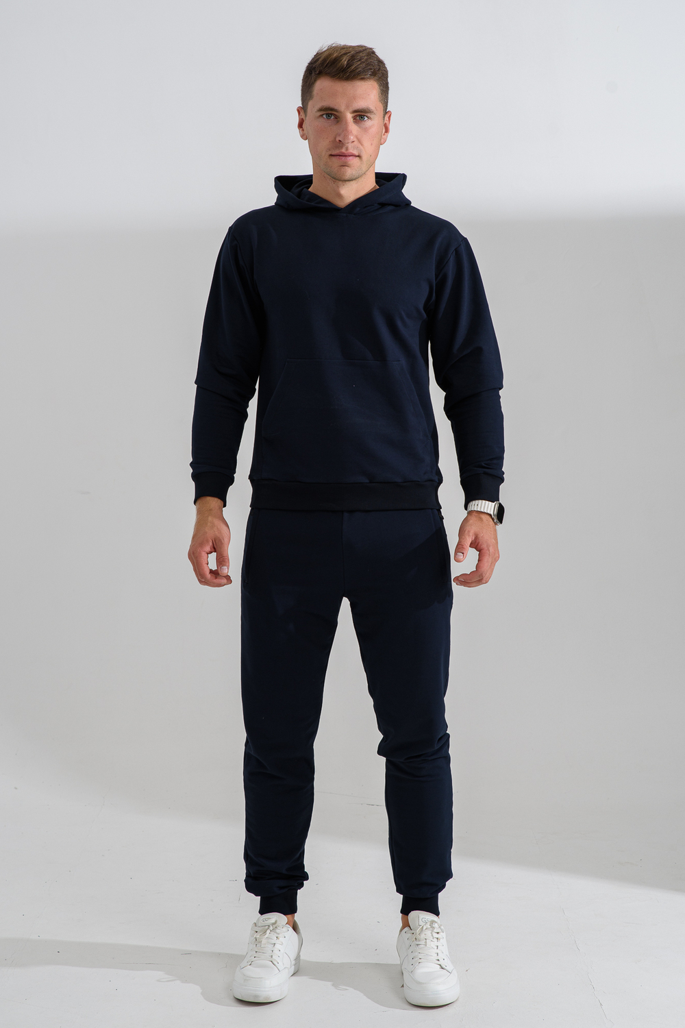 Костюм спортивный мужской с худи и джоггерами. Костюм свободного кроя состоит из толстовки с капюшоном и карманом кенгуру и брюк джоггеров на манжете с карманами в боковых швах. Костюм однотонный сшит из качественного хлопкового трикотажного материала - футера 2-х нитки. Обладает отличной эластичностью, не сковывает движений. Идеален для занятий спортом. Зимой костюм возможно носить в тренажерный зал или использовать как домашнюю одежду. Цвет: темно-синий;черный; Материал: футер с лайкрой 2-х нитка;футер с лайкрой 2-х нитка; Состав: 72% хлопок , 22% п/э, 6% лайкра.