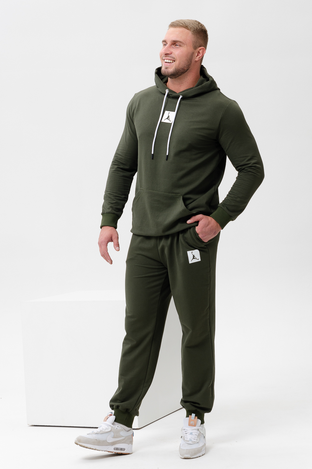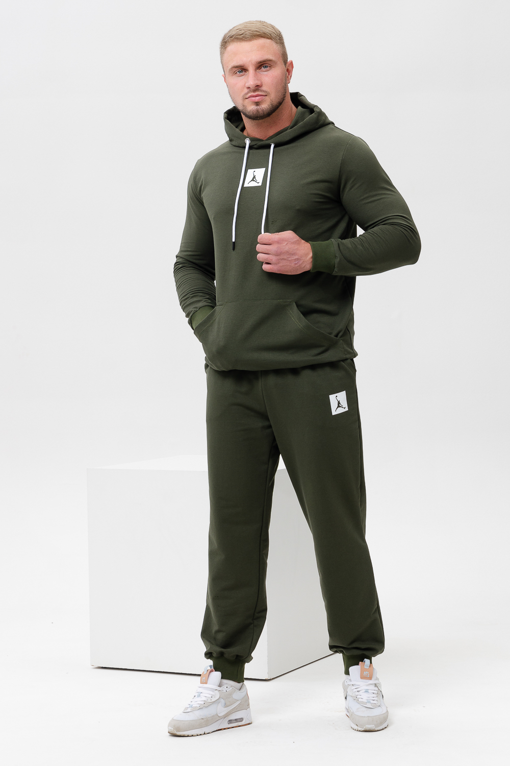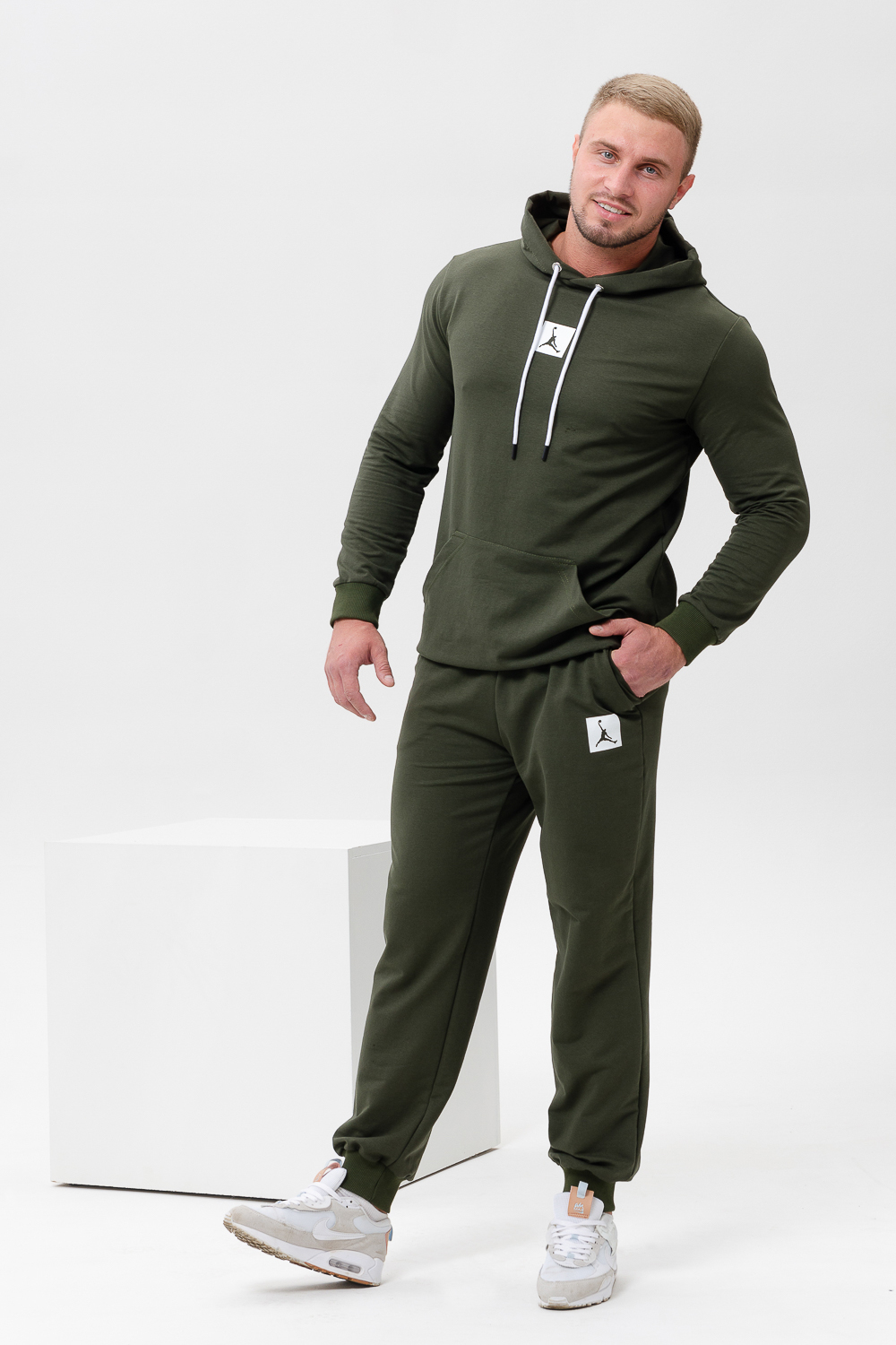 Джордан. Стильный, однотонный классический спортивный костюм отлично подойдет для тренировок дома и игр на улице. Этот модный, мягкий трикотажный костюм с прямыми и аккуратными швами. Толстовка прямого силуэта с двойным капюшоном и карманом кенгуру. Брюки на манжете с карманами в боковых швах. Цвет: хаки; Материал: футер 2-х нитка;футер 2-х нитка; Состав: 62% хлопок, 30% ПЭ, 8% лайкра.