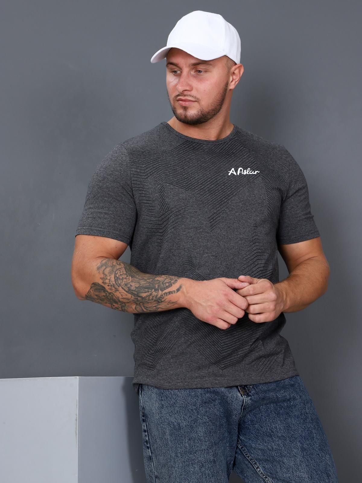 Мужская футболка выполнена их трикотажного полотна "кулирка". Футболка полу прилегающего силуэта, с рукавом, горловина  с круглым вырезом, обработанным бейкой. Передняя часть футболки декорирована принтом.
