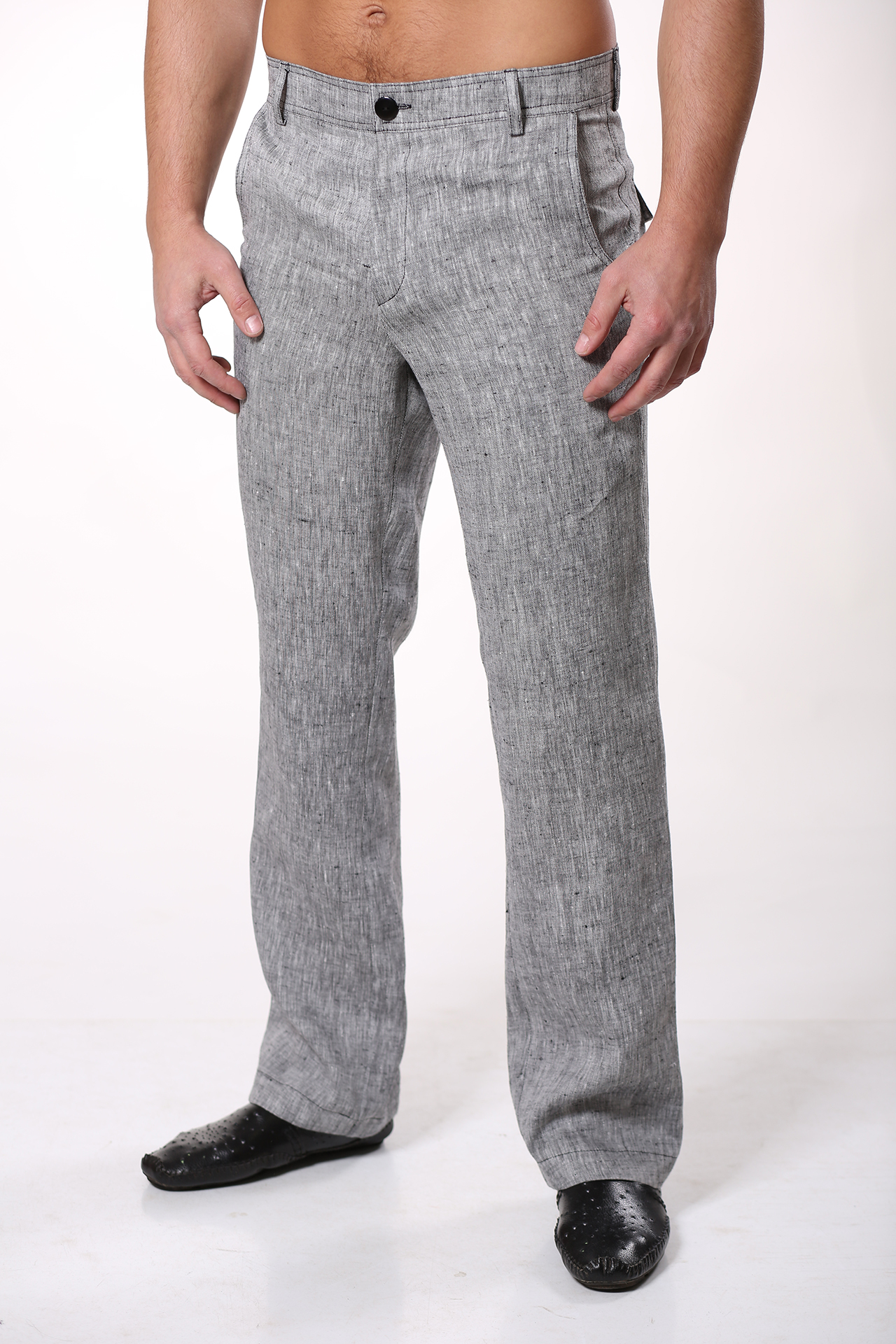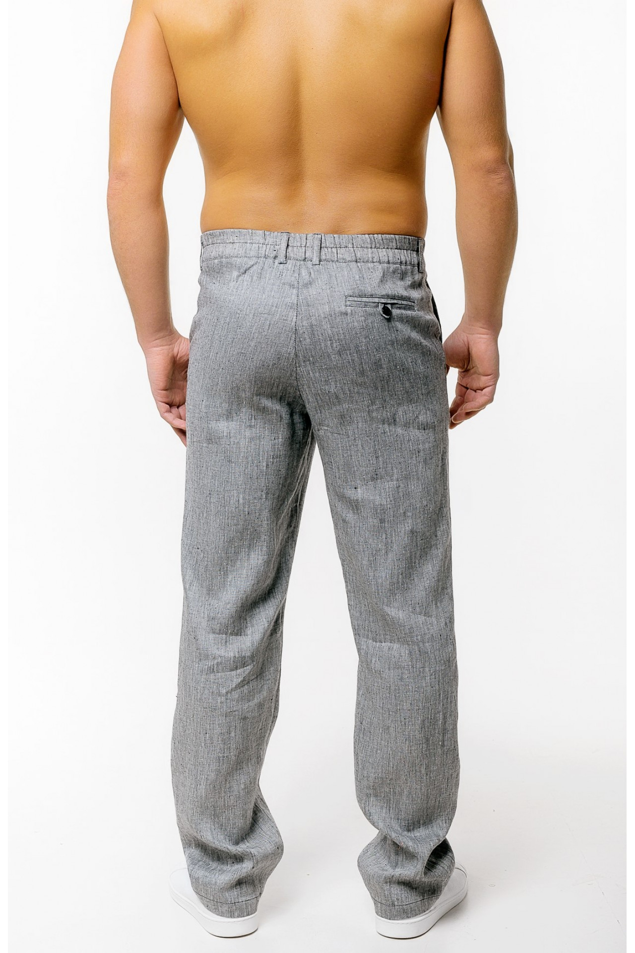 Льняные мужские брюки. Имеют классический крой и среднее облегание по ноге. На задней части имитация кармана «в рамку». На передних частях брюк 2 боковых кармана. Пояс на резинке, для более плотного прилегания.