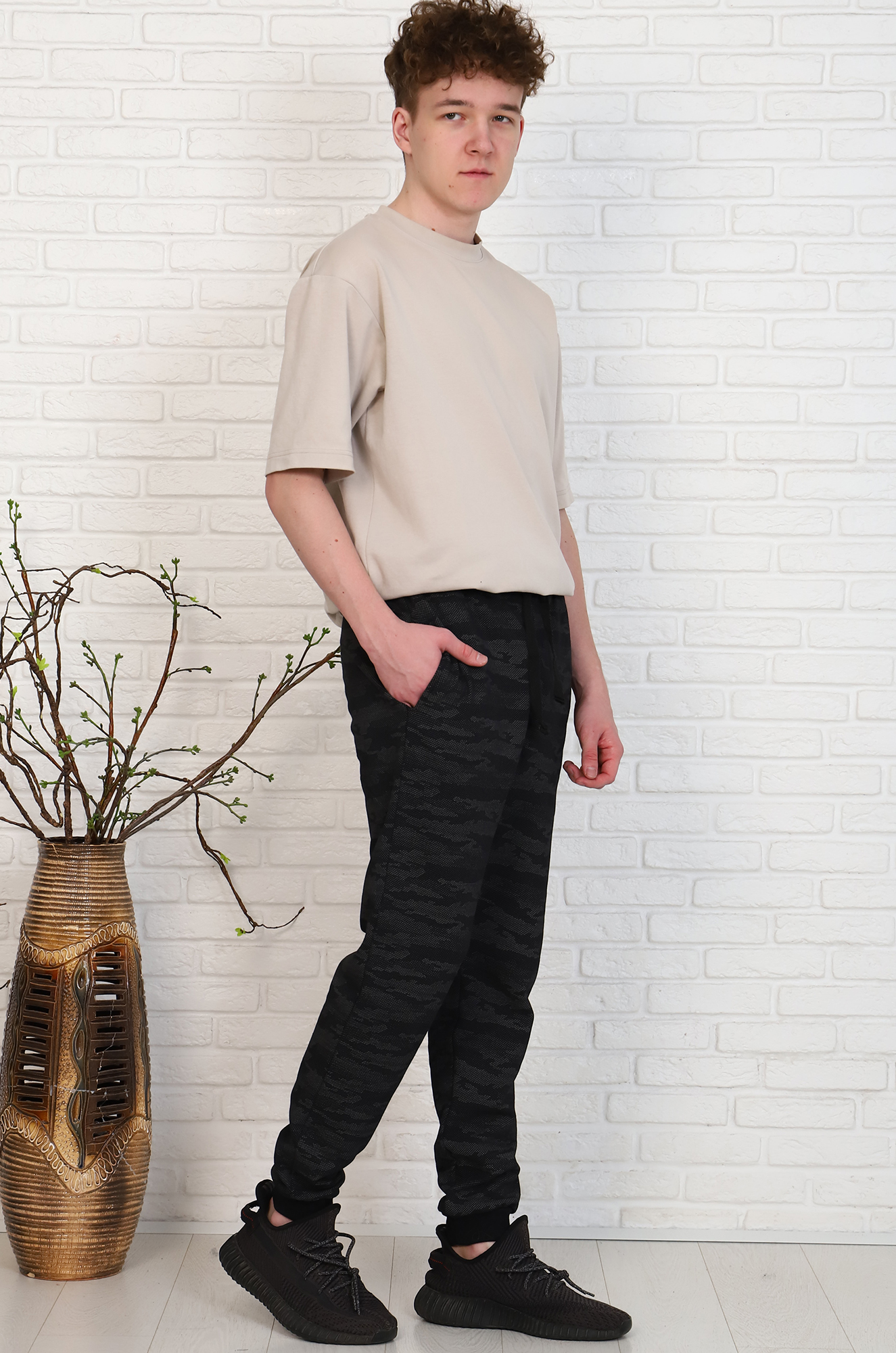 Стильные спортивные брюки для модного городского образа. Модель снизу на манжетах, пояс на широкой резинке и со шнурком, удобные боковые карманы. Расцветка ткани с набивным эксклюзивным рисунком в стиле "милитари" делает модель интересной и эффектной.