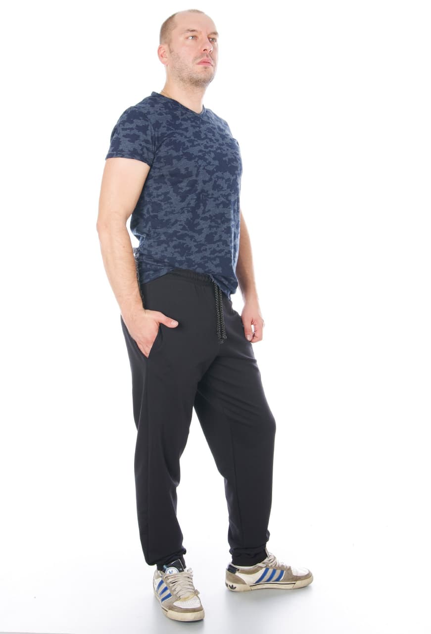 Мужские спортивные брюки на манжетах. Модель с удобными боковыми карманами, пояс на шнурке.