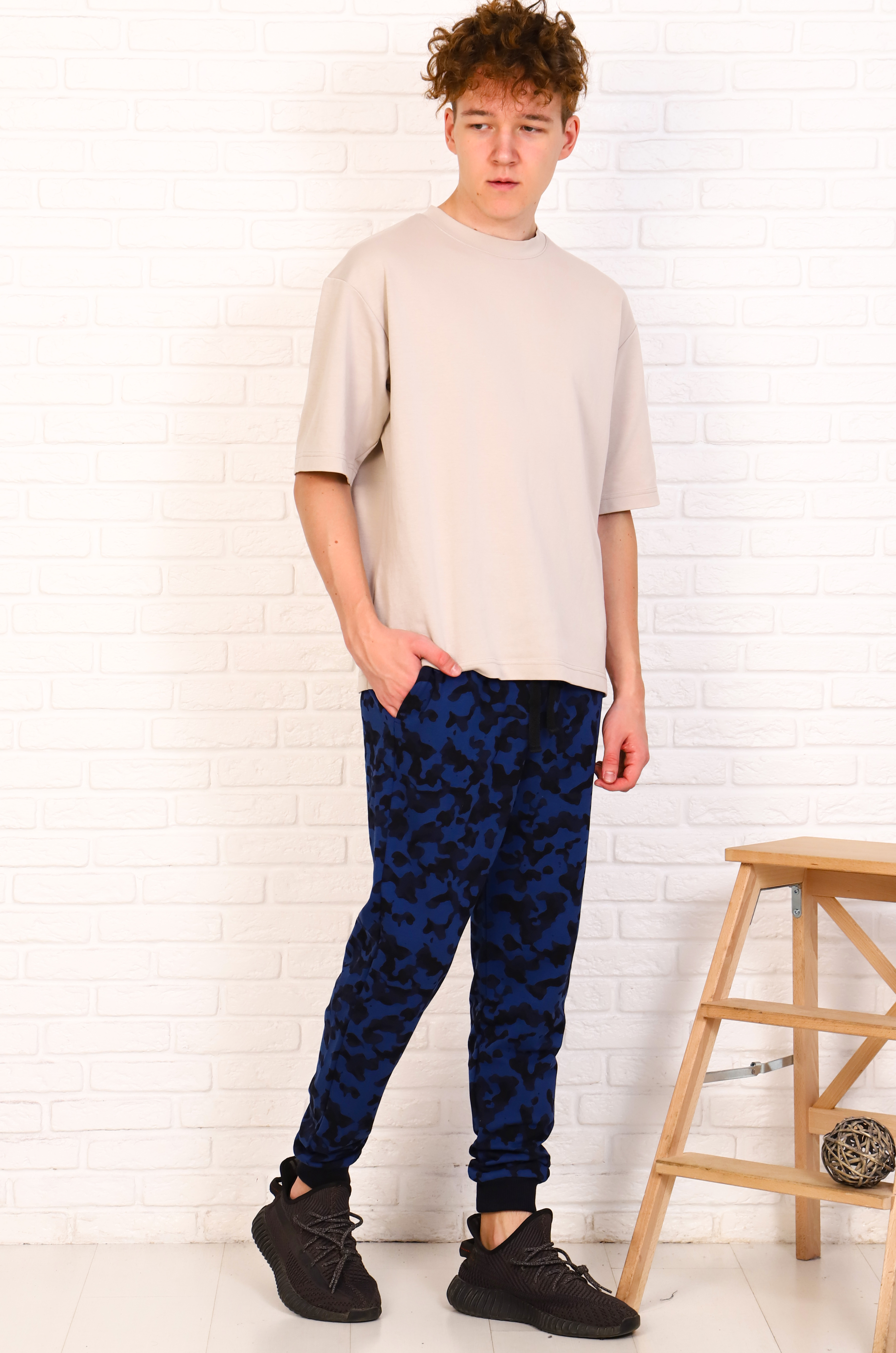 Спортивные брюки на манжетах с оригинальным принтом "милитари" придутся по вкусу мужчинам, которые следят за тенденциями моды. Модель зауженная, пояс на широкой резинке, со шнурком, удобные боковые карманы.