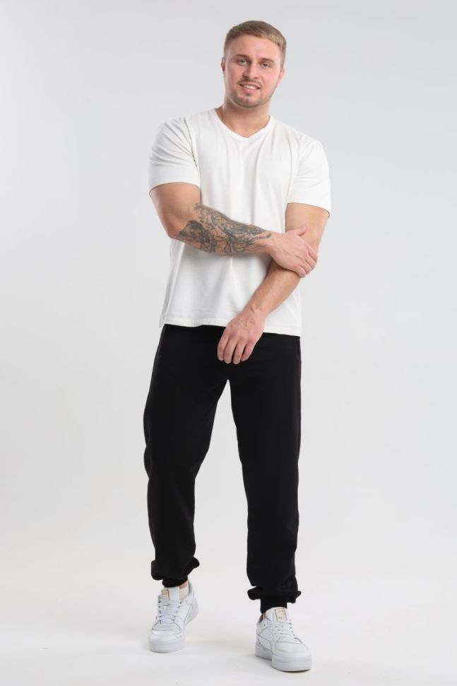 Ткань: футер 2-х нитка; Состав: 72% хлопок, 20% полиэстер, 8% эластан; Производство: г. Иваново, швейное производство НАТАЛИ; Тип изделия: брюки; Цвет: черный
