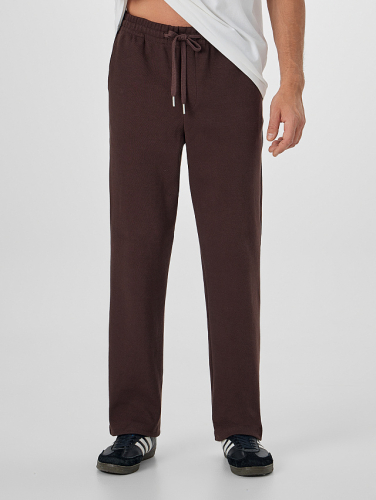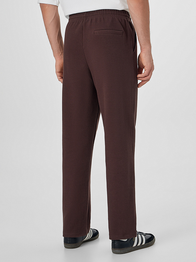 Брюки зауженные книзу, посадка средняя. Пояс цельнокроёный с эластичной тесьмой внутри. С внешней стороны пробиты петли и втянут шнур с застроченными концами. На левой детали переда имитация гульфика. По переду карманы с отрезными бочками. На правой детали спинки имитация кармана "в рамку с листочкой". Нижние срезы брюк обработаны швом вподгибку.