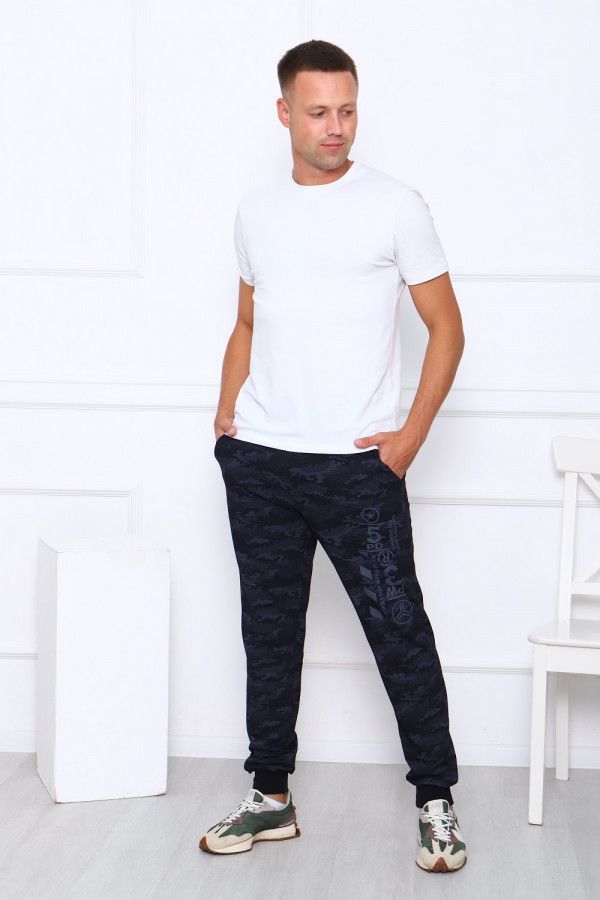 Брюки мужские Камуфляж с боковыми карманами и с тематическим принтом на левой штанине, низ на манжетах, комфортный широкий эластичный пояс. Материал устойчив к растягиванию на коленях, износостойкий.