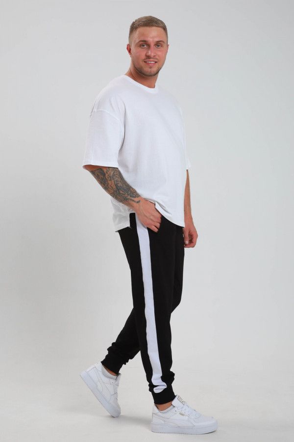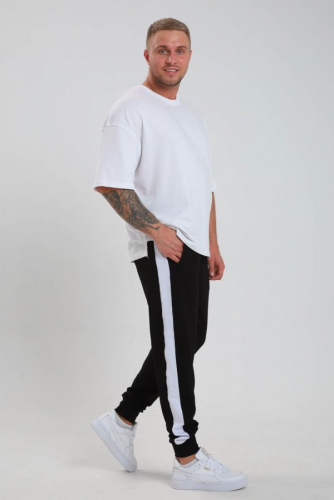 Спортивные стильные брюки с лампасами, высокого качества из турецкой ткани. Пояс на резинке, по бокам два кармана на молнии, низ на манжетах. Отлично подходят для домашней и спортивной носки, сохраняя форму и не скатываясь после многочисленных стирок.