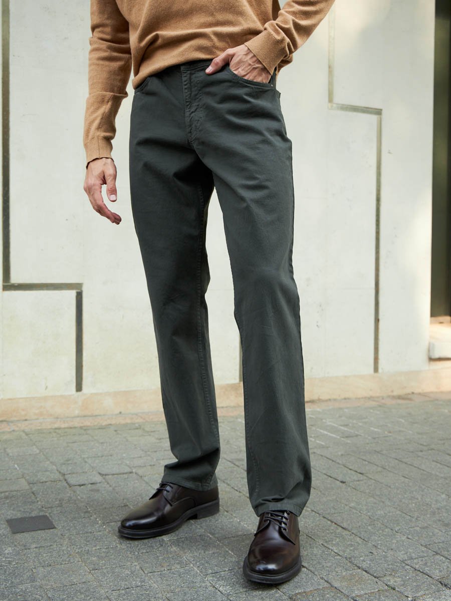 Мужские брюки в джинсовом стиле с пятью карманами. Посадка Regular fit (полуоблегающие по бедру), немного заужены к низу, высокая талия. Застежка на молнии. Выполнены из слабоэластичной мягкой ткани gabardine stretch с небольшим peach (персиковым) эффектом по лицевой поверхности ткани. Крашение Garment dayed , т.е. покрашены в готовом виде после пошива.