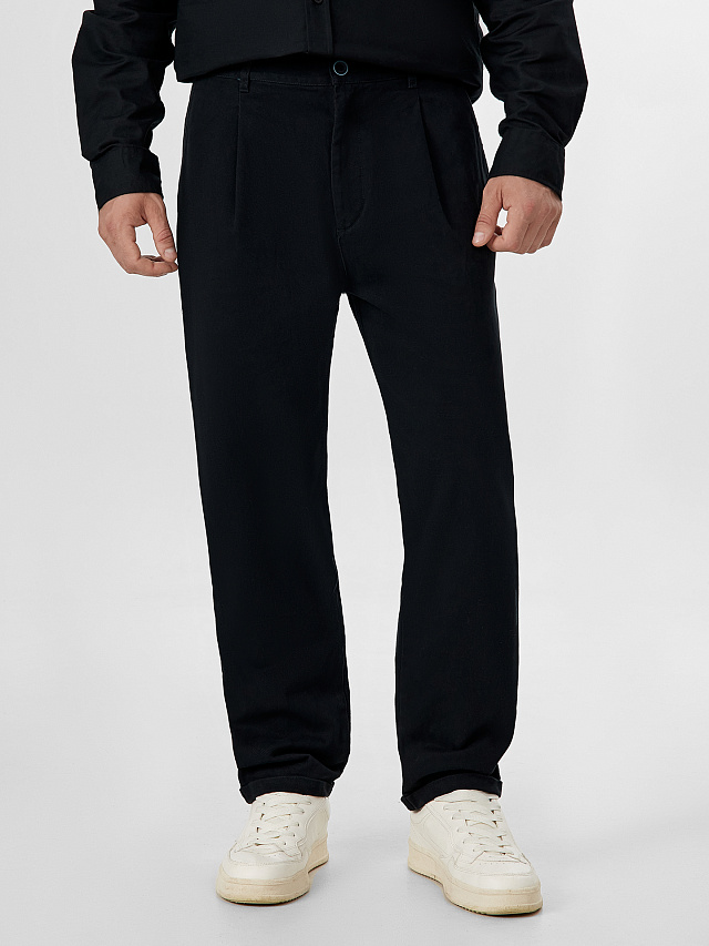 Мужские брюки черные прямого кроя из хлопка — универсальная модель для повседневной носки. Классический пояс с застежкой на молнию и пуговицу обеспечивает удобную посадку, а практичные боковые карманы позволяют хранить мелочи. Прямой силуэт не сковывает движений, делая брюки идеальными для офиса, прогулок или отдыха.