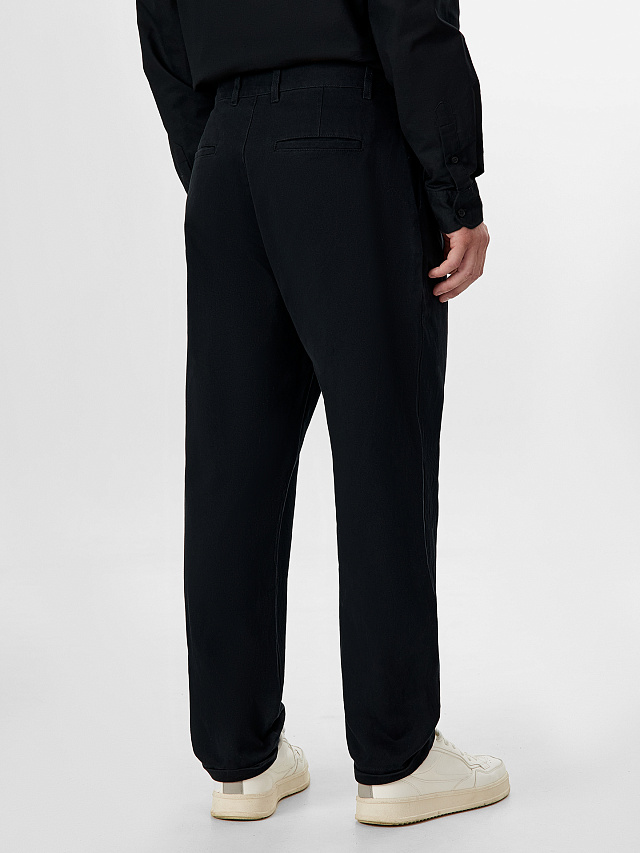 Натуральный хлопок обеспечивает воздухопроницаемость и комфорт в течение всего дня. Брюки сохраняют форму и цвет после множества стирок, не теряя мягкости. Универсальный черный оттенок сочетается с любым верхом, от футболок до рубашек. Практичный и лаконичный дизайн делает эти брюки надежным выбором для базового гардероба. Идеально для создания стильных повседневных образов.