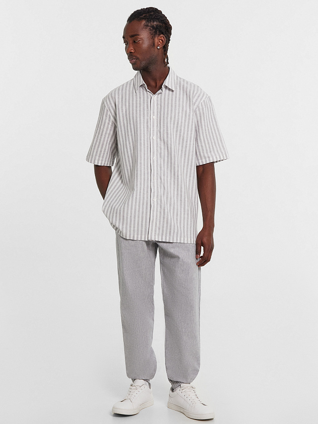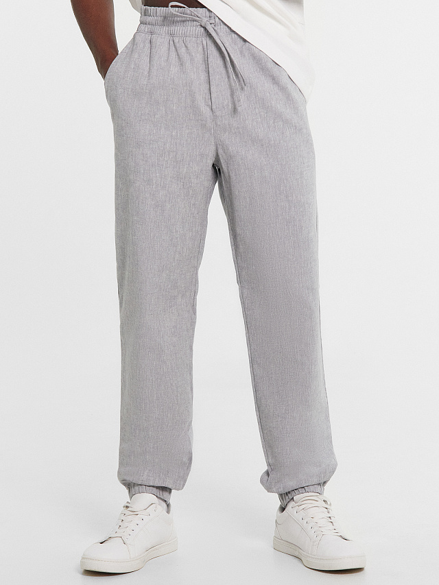 Текстильные брюки классической длины из натурального хлопка и льна. Силуэт свободный, немного зауженный к низу. Пояс с эластичной тесьмой внутри и регулировочным шнуром. Есть карманы-хулиганы. По низу штанин – эластичная тесьма. Гульфик не функциональный, имитация. Стильные брюки!
