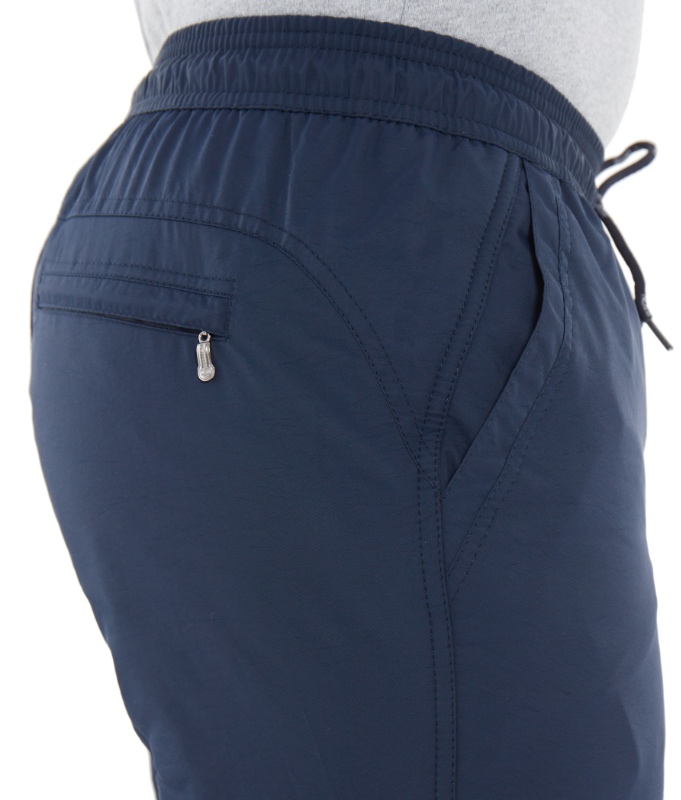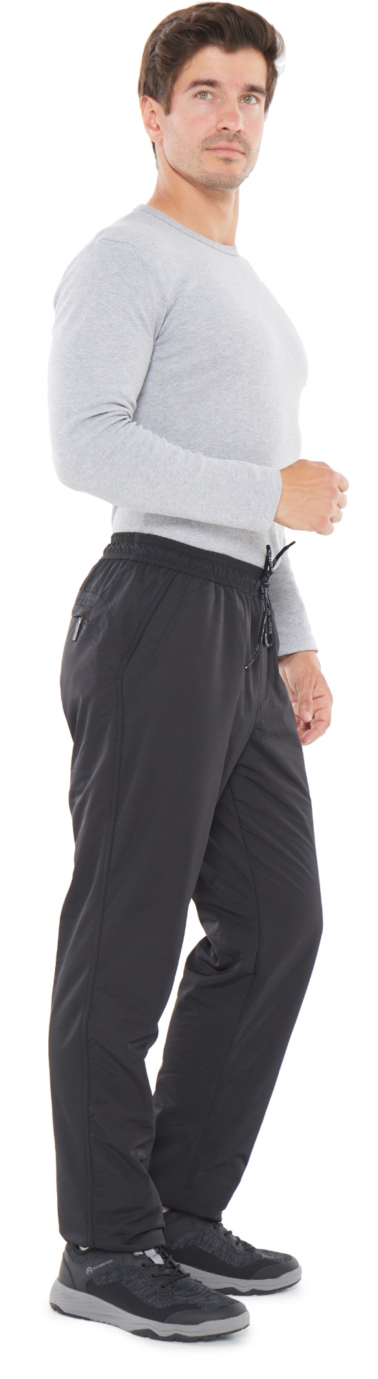 Зимние брюки с поясом на резинке. С наружной стороны пояс фиксируется шнурком с наименованием торговой марки. Ткань со специальной обработкой наружной стороны и полиуретановым покрытием на внутренней стороне обеспечивает защиту от ветра и влаги. Прочная и практичная, ткань не теряет внешнего вида в условиях суровой зимы, не грубеет на морозе. Утепляющая подкладка из плотного флиса на трикотажной основе не вытягивается, держит форму, а благодаря антипиллинговой обработке не скатывается даже после многочисленных стирок. Брючины немного заужены книзу. Имитация гульфика. Передние карманы прямые открытые, отстрочены вдоль линии входа. Сзади кокетка, ниже которой расположен карман на молнии под листочкой.