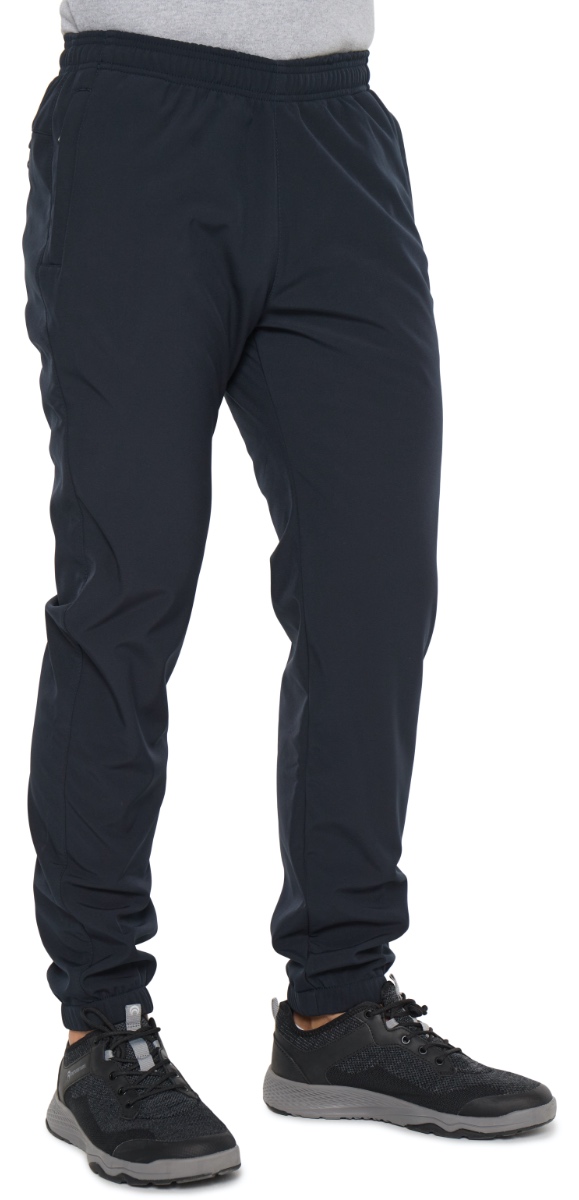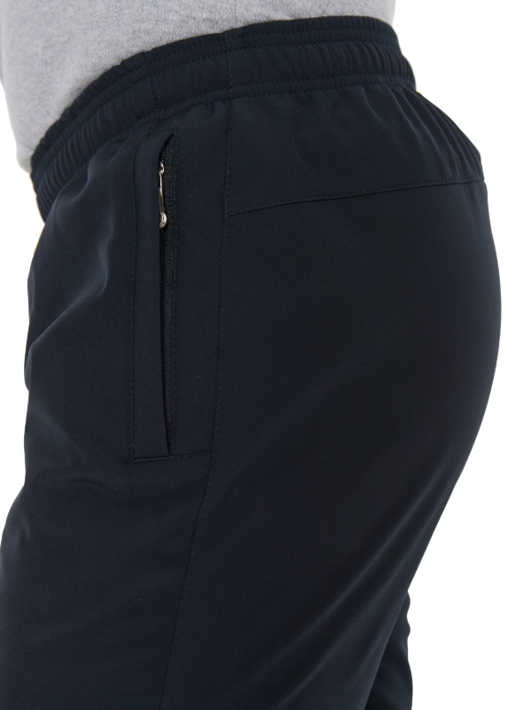 Джоггеры с поясом на резинке. Отшиты из ткани Windstopper Softshell для спорта и активного отдыха. Ткань представляет собой трёхслойную систему, состоящую из лицевой ткани (эластичный полиэстер), мембраны (защита от ветра и паропроницаемость) и утеплителя (флис), соединенных в единое целое. Благодаря такой структуре обладает водоотталкивающими свойствами и в то же время пропускает водяной пар, т.е. способна "дышать". Наличие нитей эластана делает ткань подвижной, а изделие более комфортным. Для дополнительной фиксации в пояс с внутренней стороны вставлен шнурок. Брючины заужены книзу и заканчиваются манжетами. Передние карманы на молниях под листочками. Сзади кокетка, под которой расположен горизонтальный карман на молнии, прикрытый листочкой.