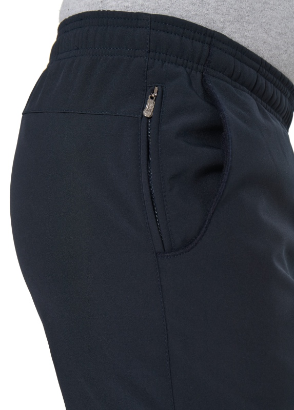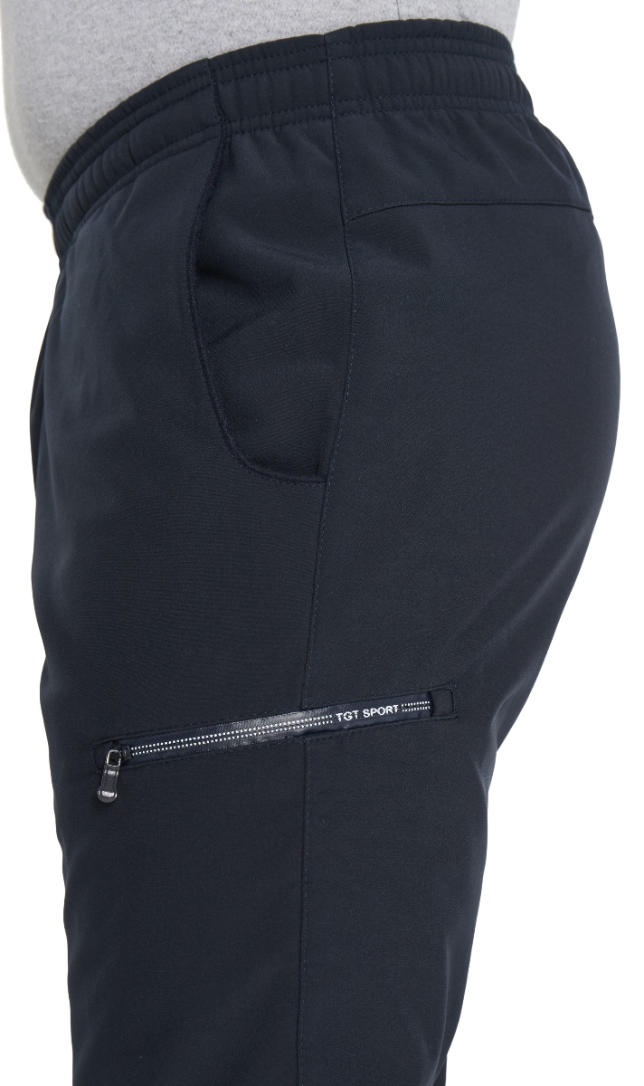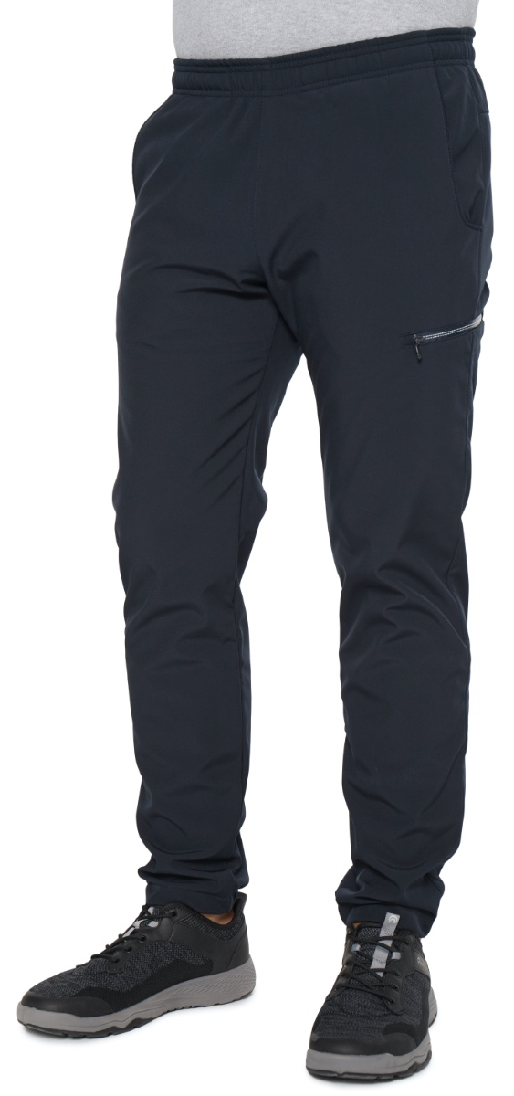 Джоггеры с поясом на резинке. Отшиты из ткани Windstopper Softshell для спорта и активного отдыха. Ткань представляет собой трёхслойную систему, состоящую из лицевой ткани (эластичный полиэстер), мембраны (защита от ветра и паропроницаемость) и утеплителя (флис), соединенных в единое целое. Благодаря такой структуре обладает водоотталкивающими свойствами и в то же время пропускает водяной пар, т.е. способна "дышать". Наличие нитей эластана делает ткань подвижной, а изделие более комфортным. Для дополнительной фиксации в пояс с внутренней стороны вставлен шнурок. Брючины заужены книзу и заканчиваются манжетами. Передние карманы полукруглые открытые. У входа в правый передний карман параллельно боковому шву расположен вертикальный карман на молнии в «рамку. На наружной стороне левой брючины выше уровня колена выполнен горизонтальный карман, фиксирующийся прорезиненной молнией с логотипом торговой марки на корде. Сзади кокетка.